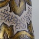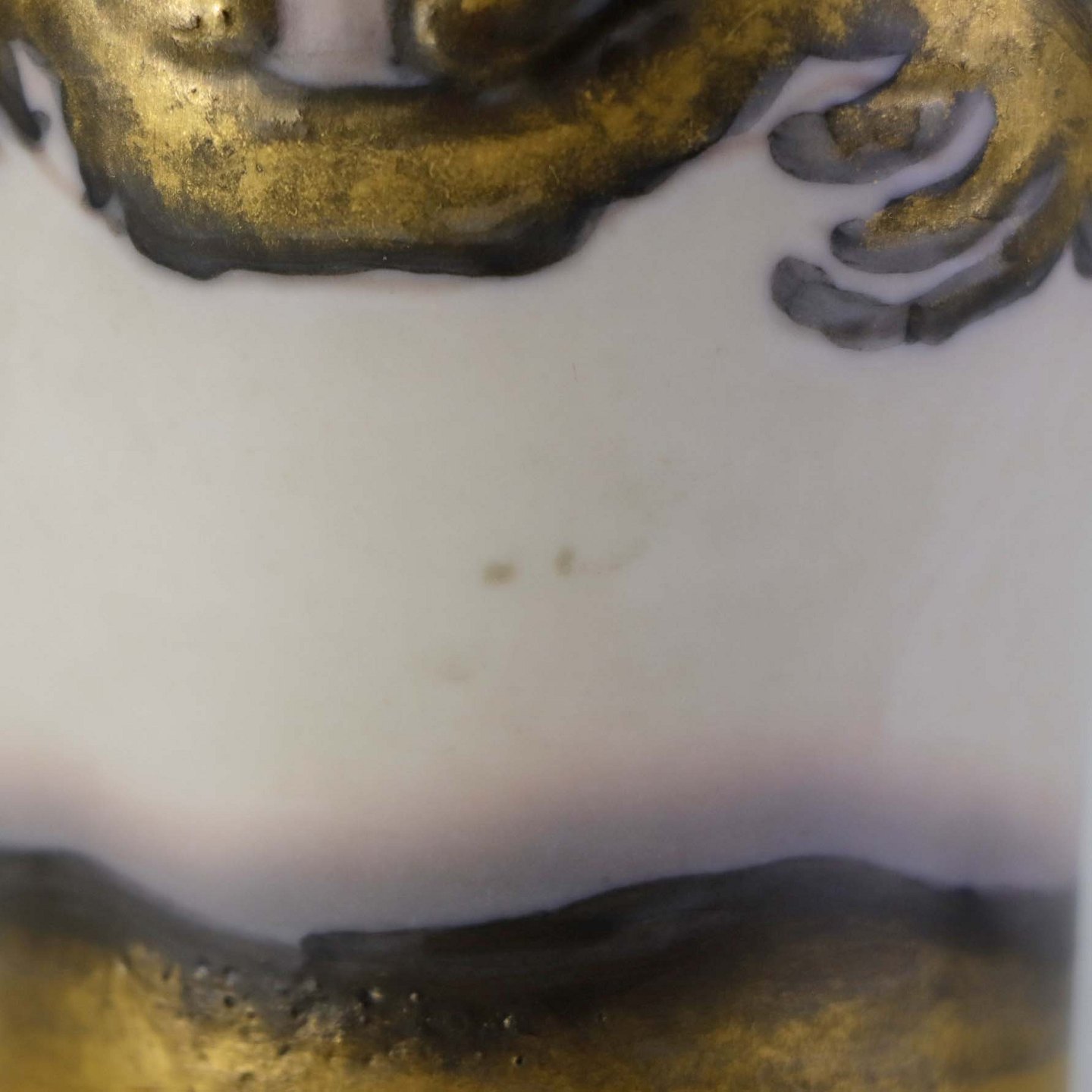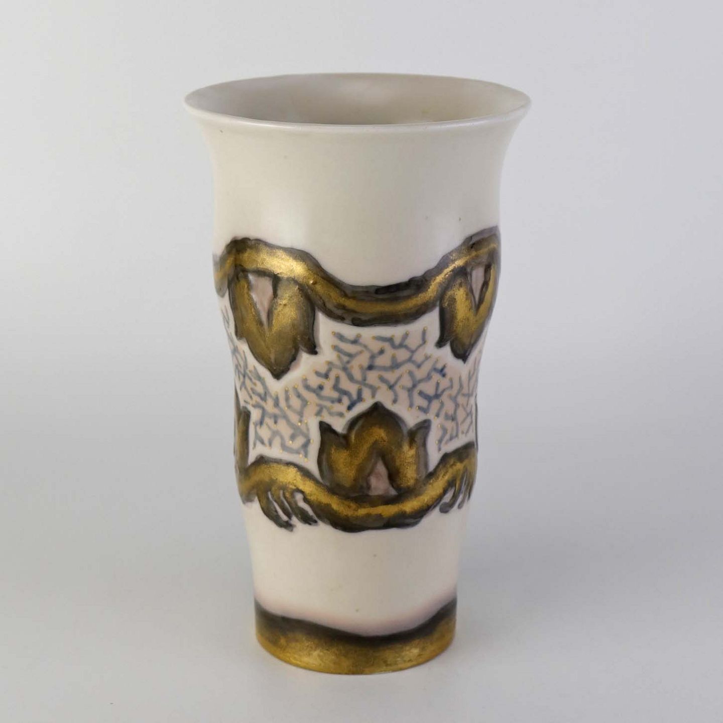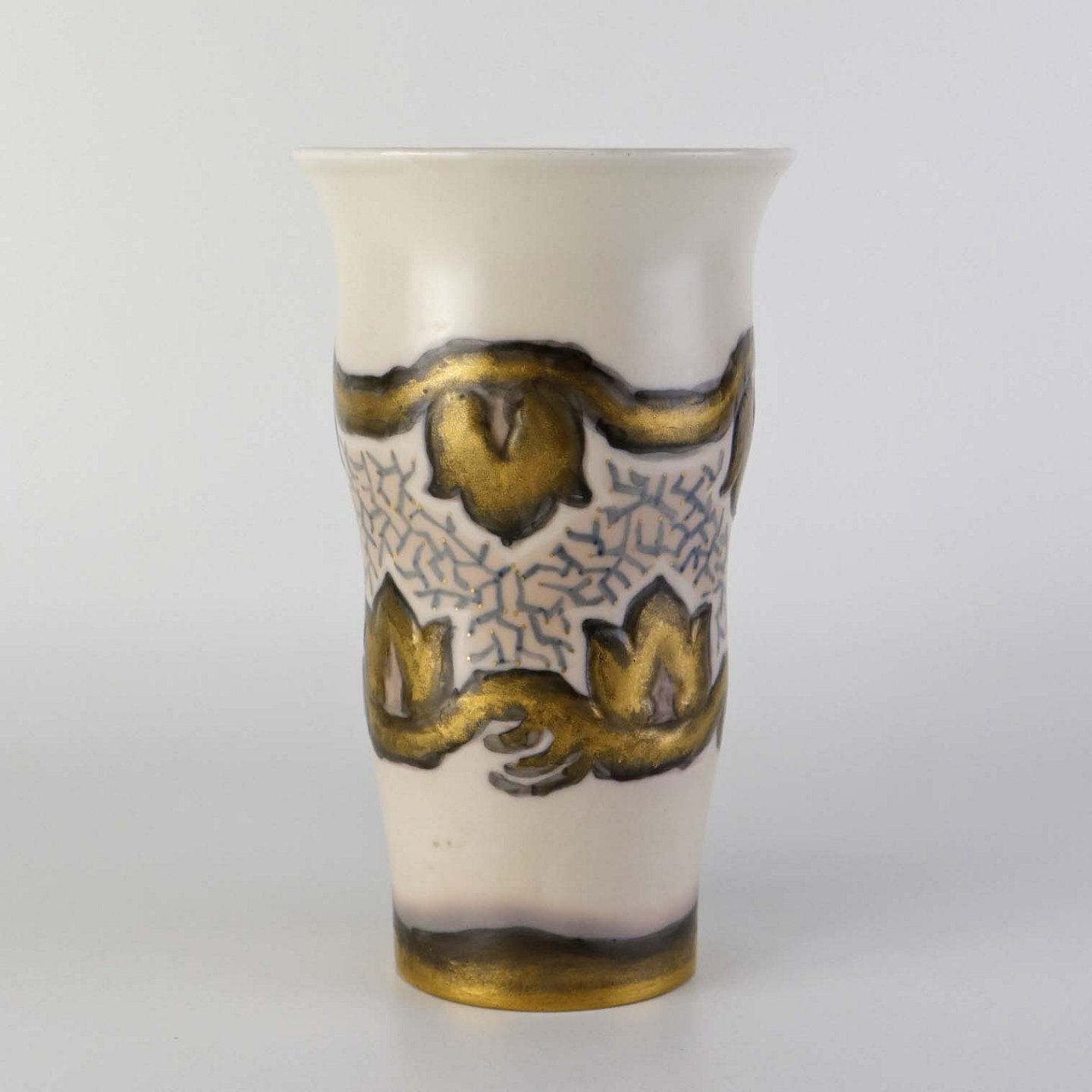 Unika vase i porcelæn med abstrakt mønster i blå og guld på lys baggrund. Nr. 87