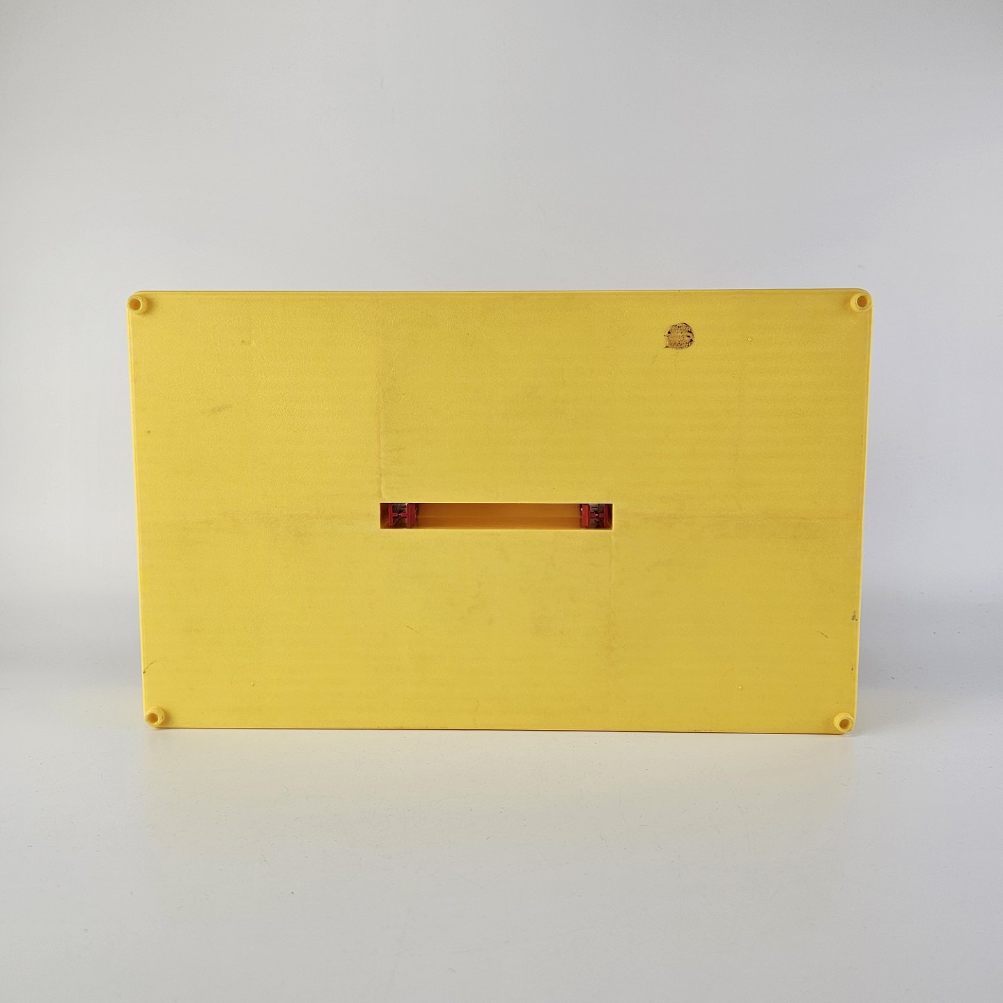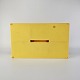 Tre opbevaringskasser i plast. Håndtaget kan trækkes op og ned, og kasserne kan stables