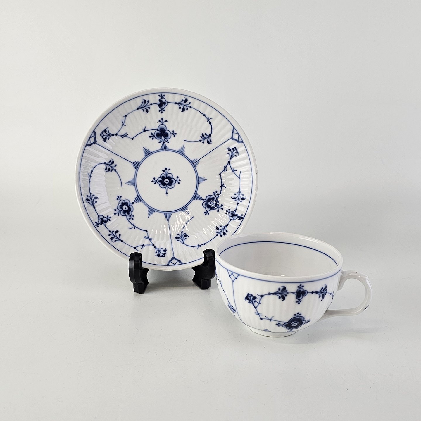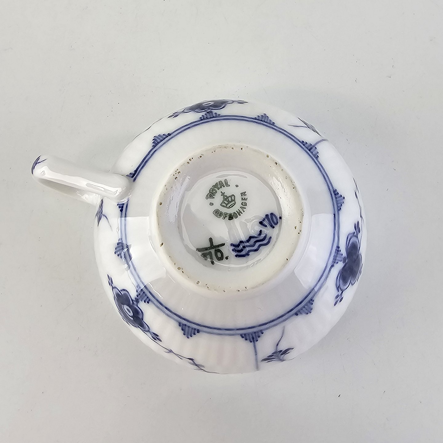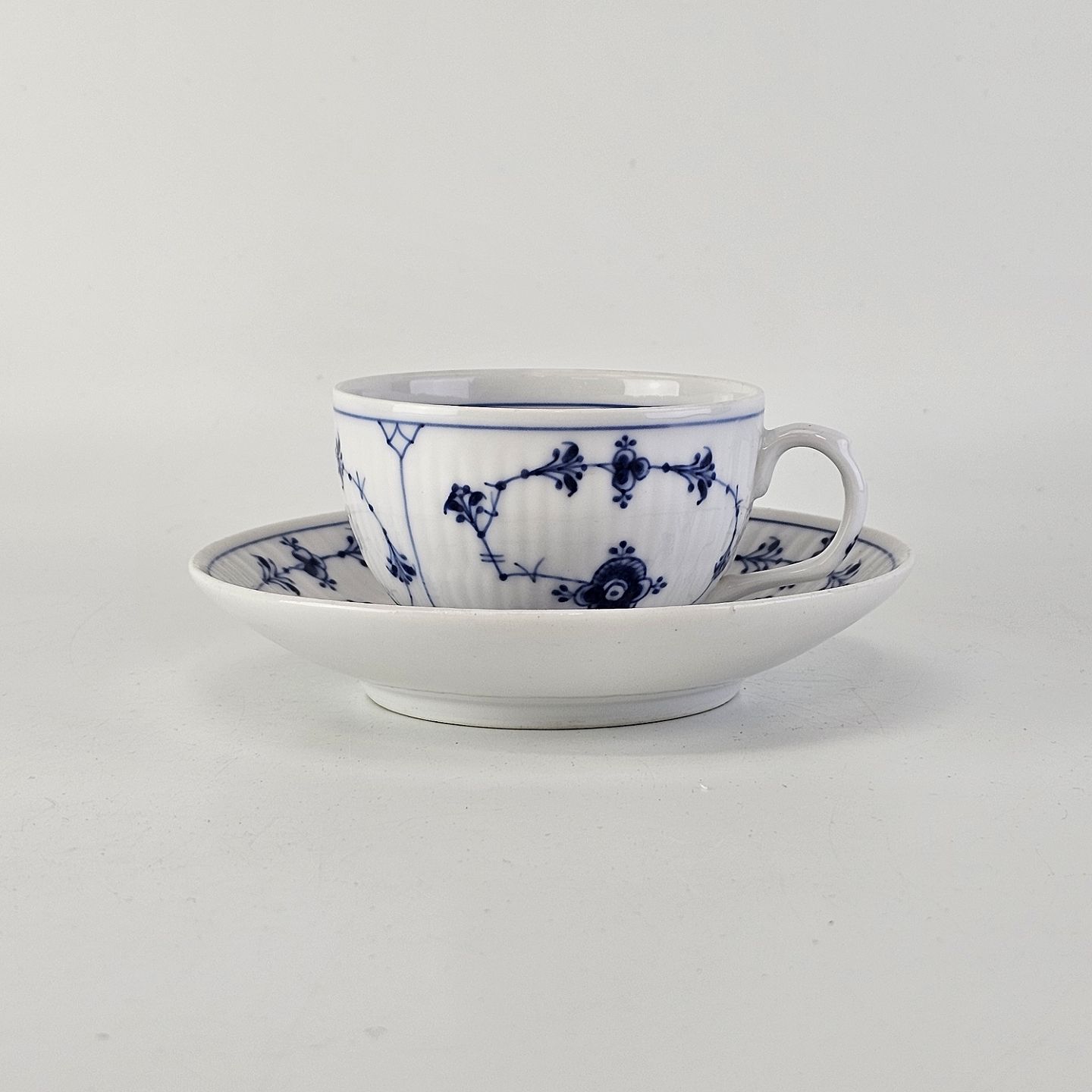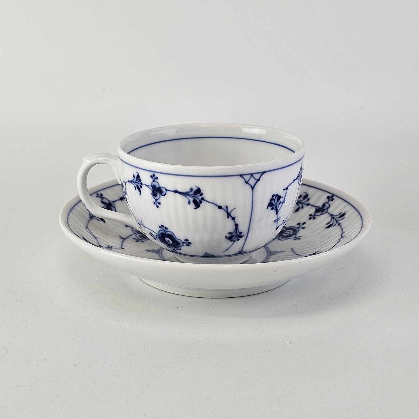 Kop og underkop i hvidt porcelæn fra stellet Musselmalet Riflet