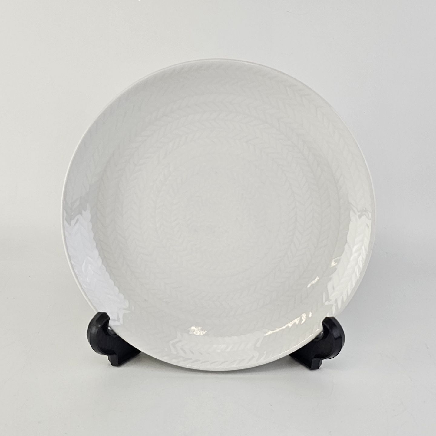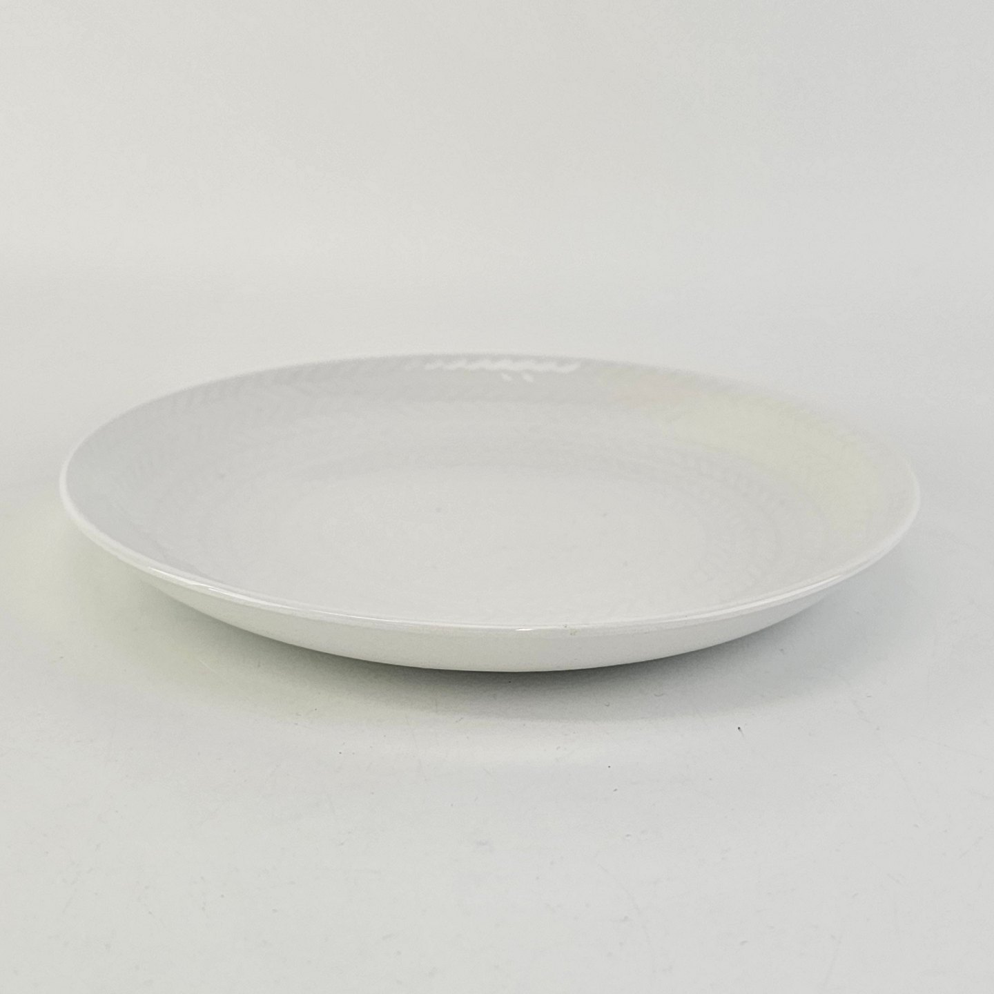 Flad tallerken fremstillet i hvid fajance med indstøbt sildebensmønster