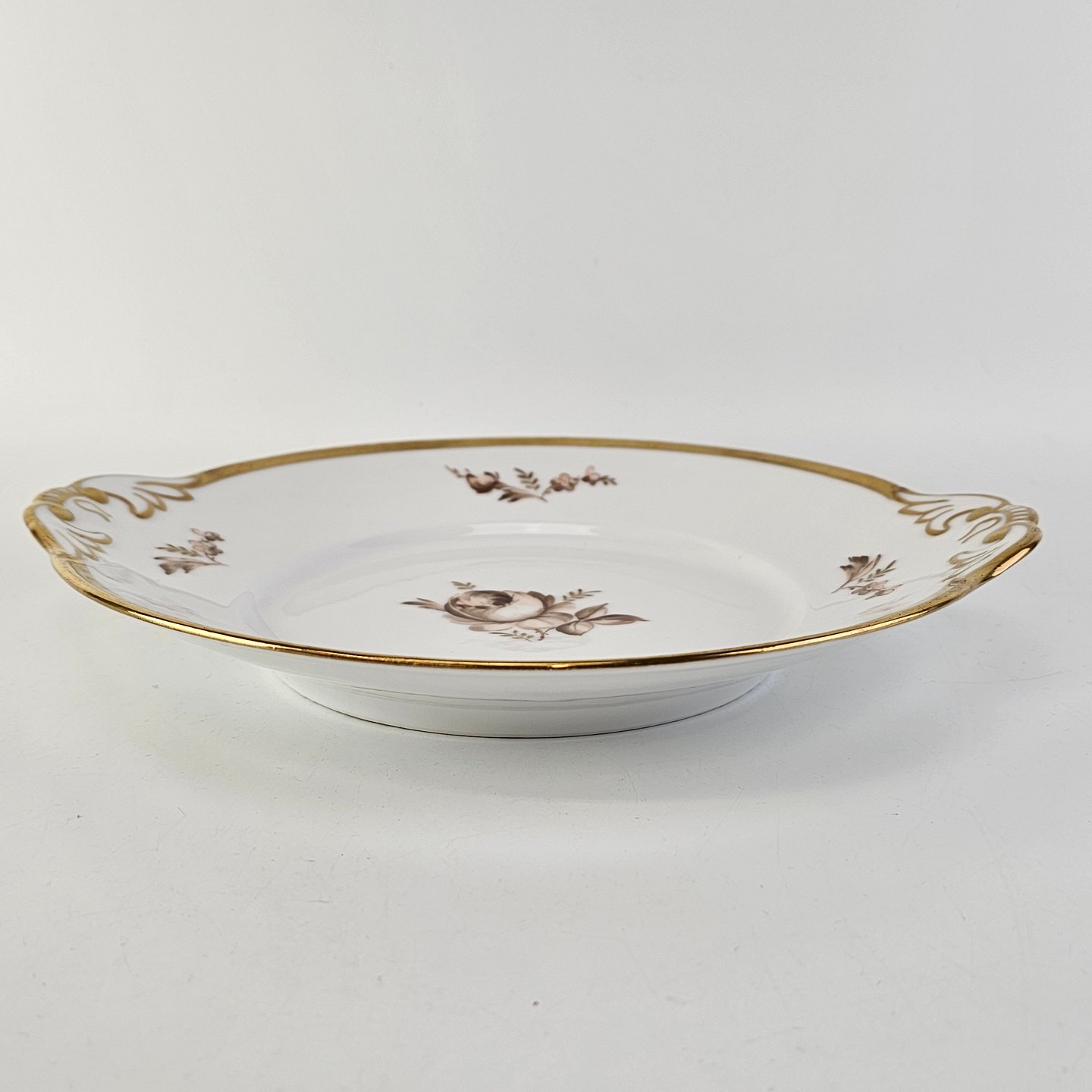 Stel i glat hvidt porcelæn dekoreret med brune roser og guldbort