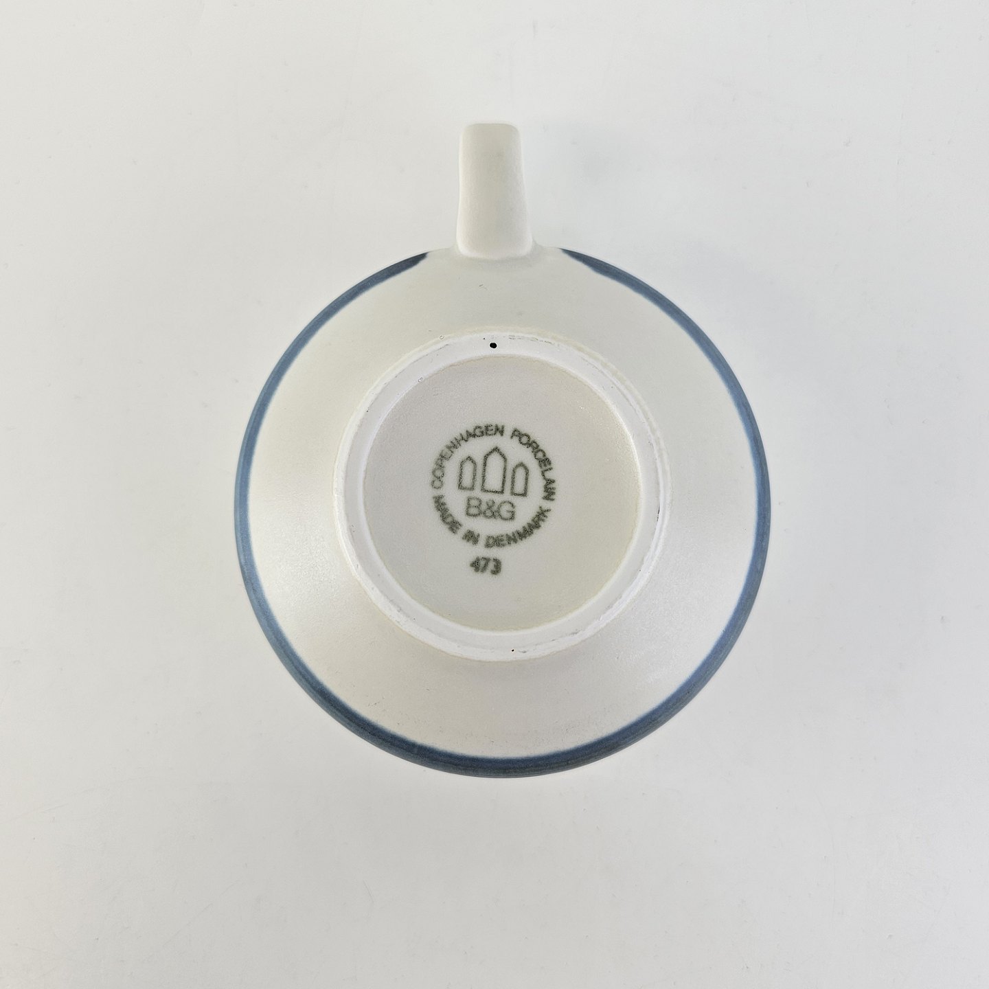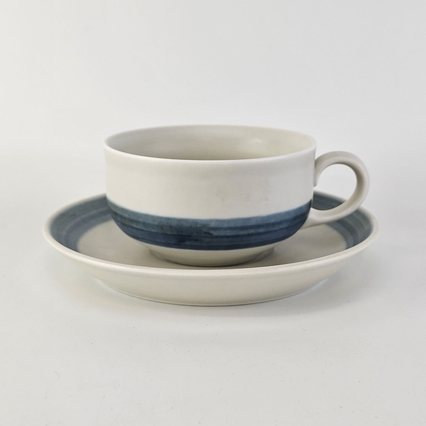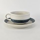Kop og underkop i stentøj fra stellet Edith Sonne, mat hvid dekoreret med en blå stribe
