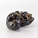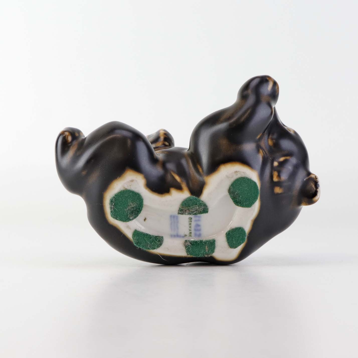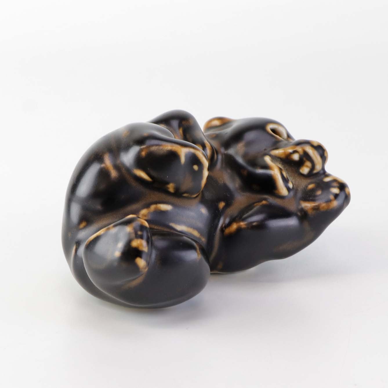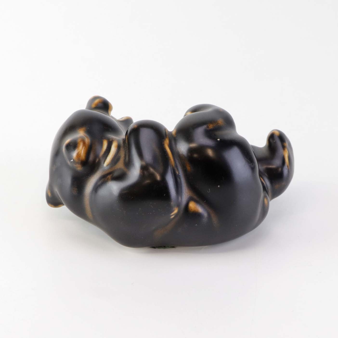 Figur i brunglaseret stentøj med motiv af liggende og legende bjørneunge. Nr. 21432