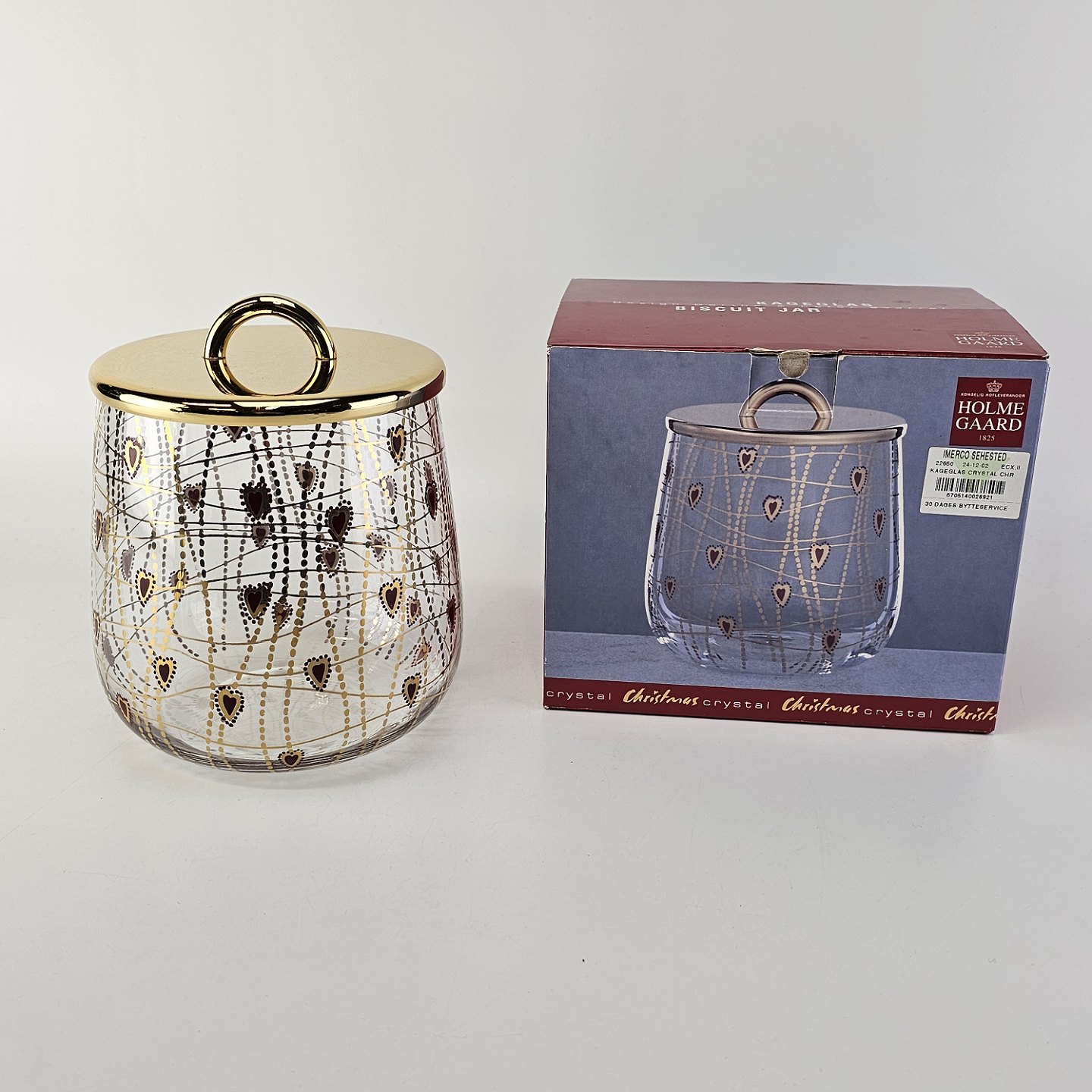 Kagedåse af glas med mønster af røde hjerter og guldstreger, og gyldent låg