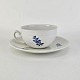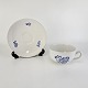 Stel i glat hvid fajance med dekoration af blå blomster og flettet kant