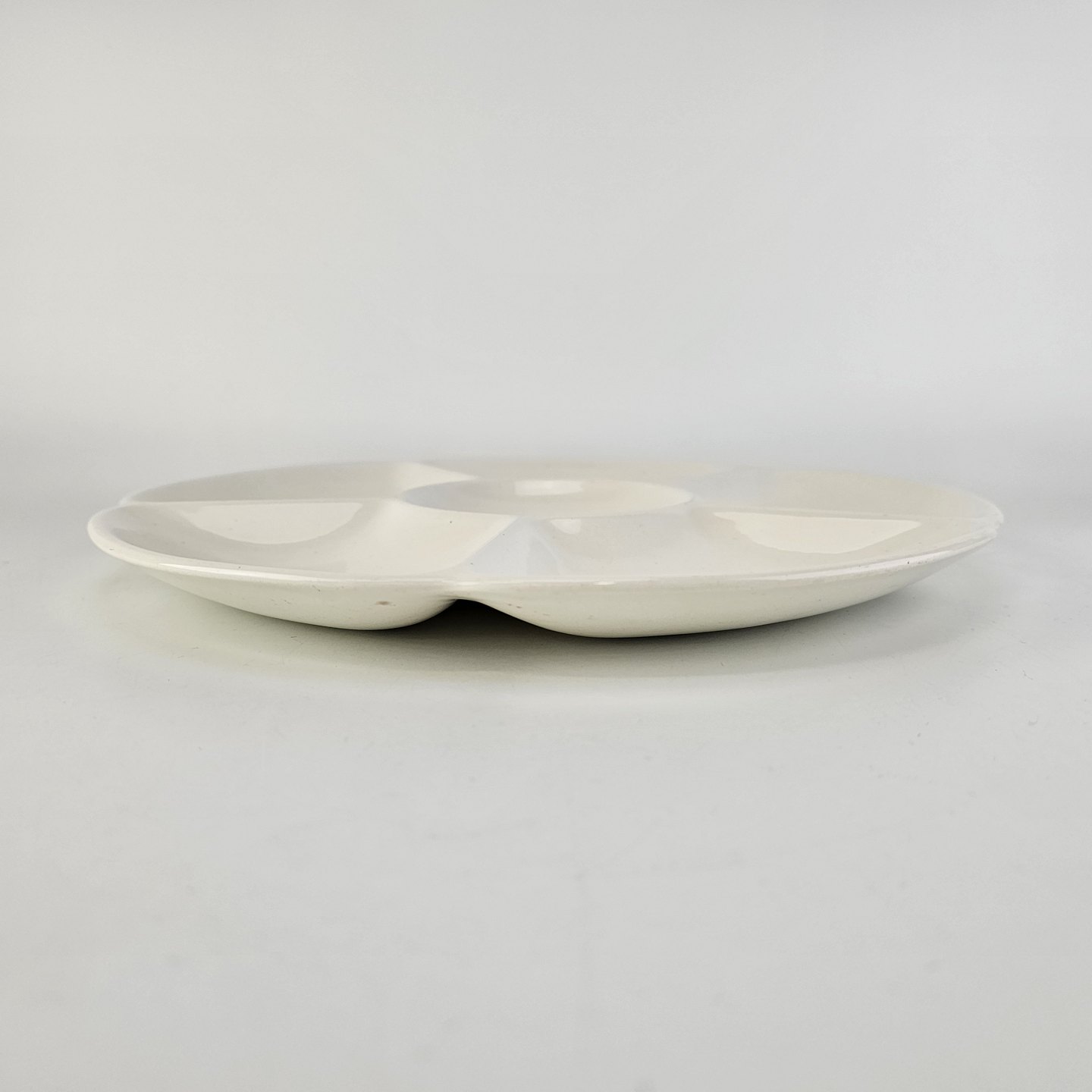 Rundt fad med seks rum i cremefarvet fajance fra stellet Alma
