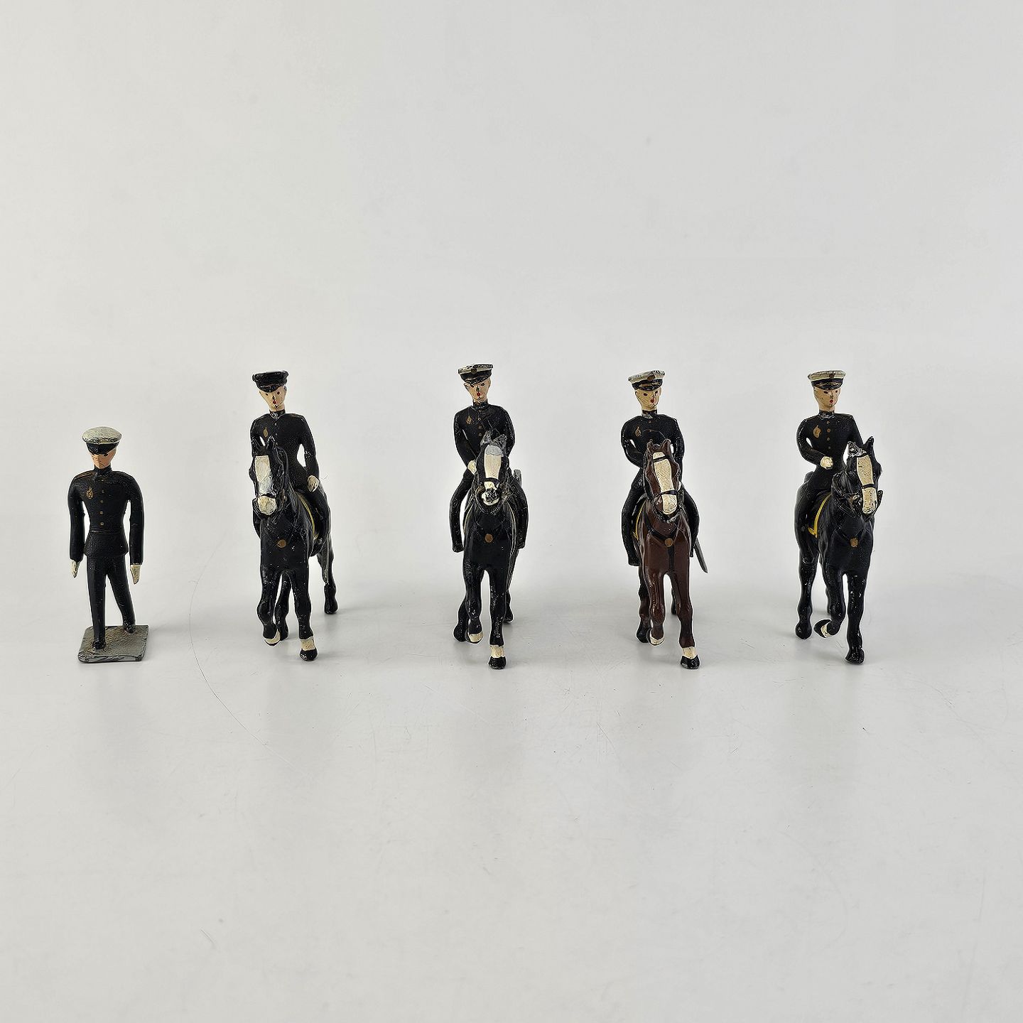 Fem figurer af politifolk i tin, én stående og fire til hest