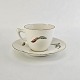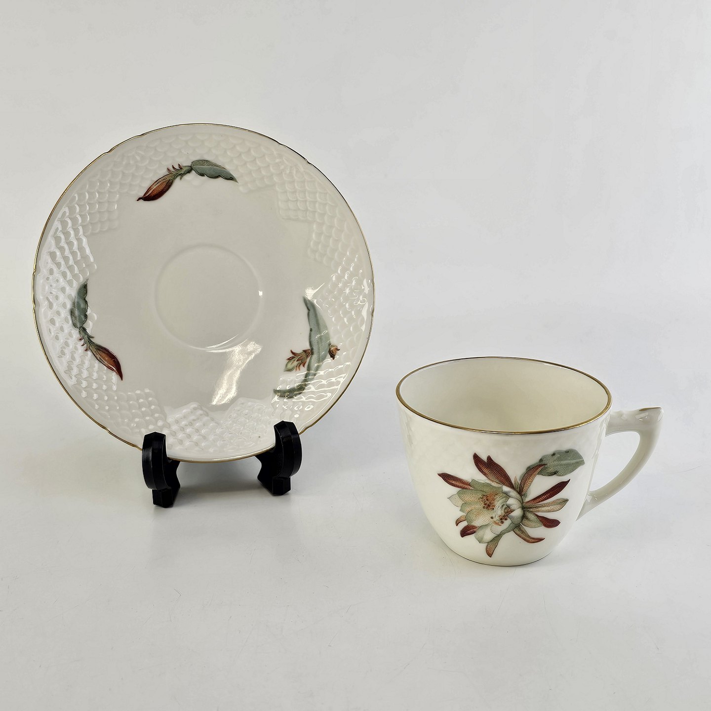 Kaktus er cremefarvet porcelæn i skælform, dekoreret med kaktusblomster og guldkant