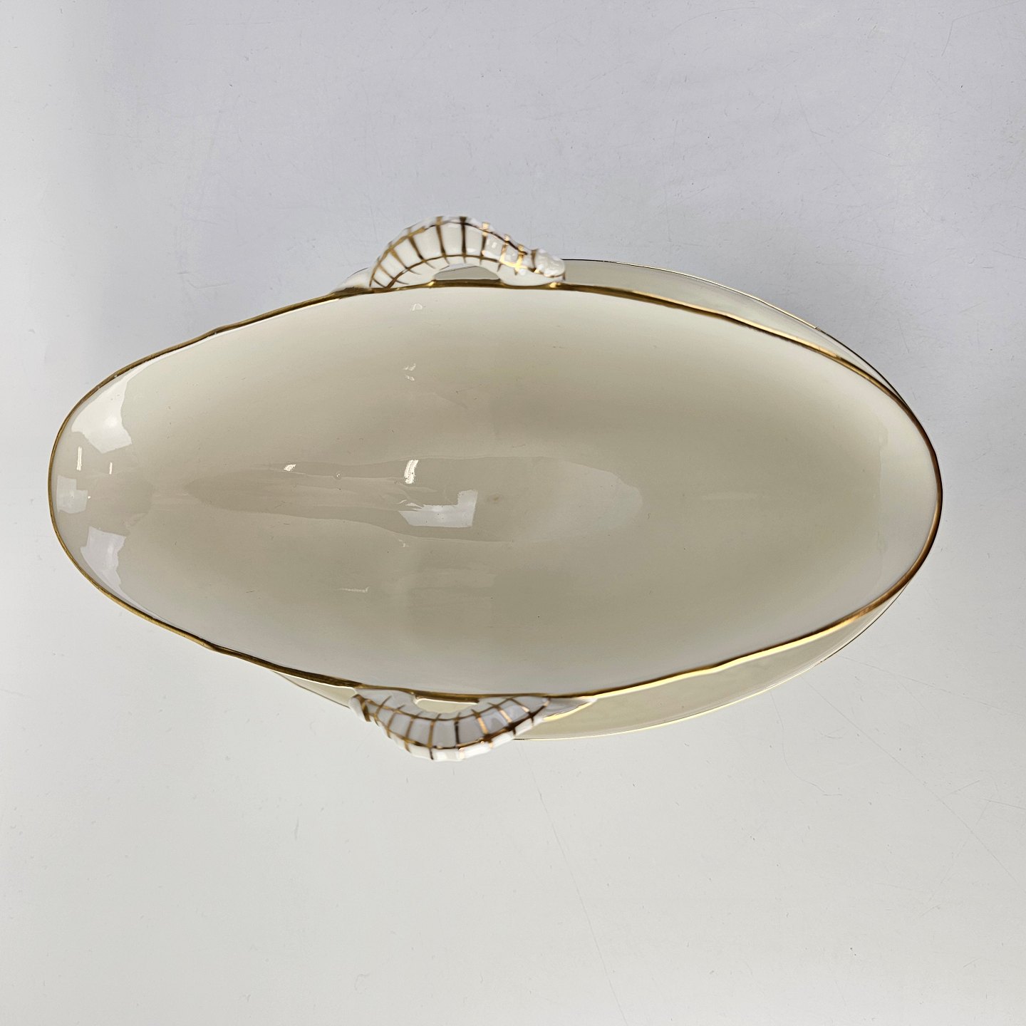 Balder er cremefarvet porcelæn i skælform, dekoreret med hyben og guldkant.