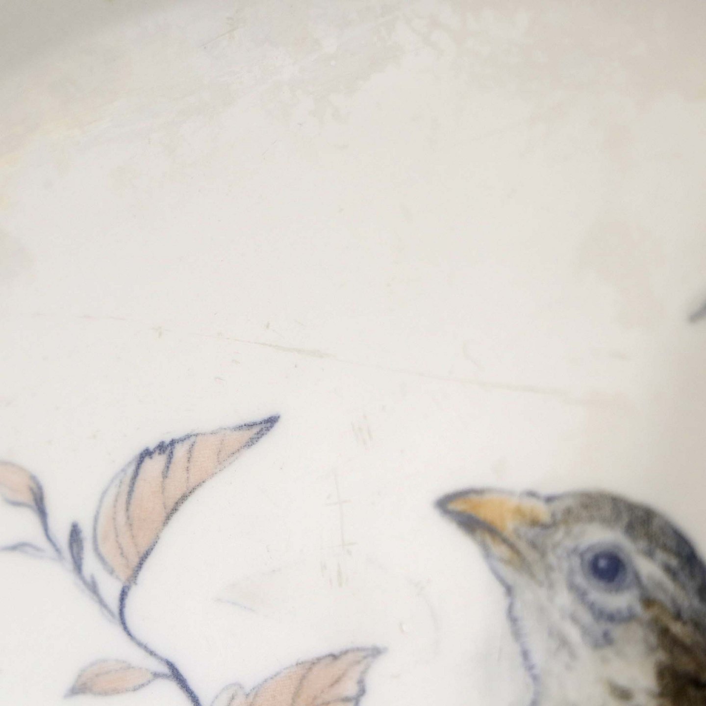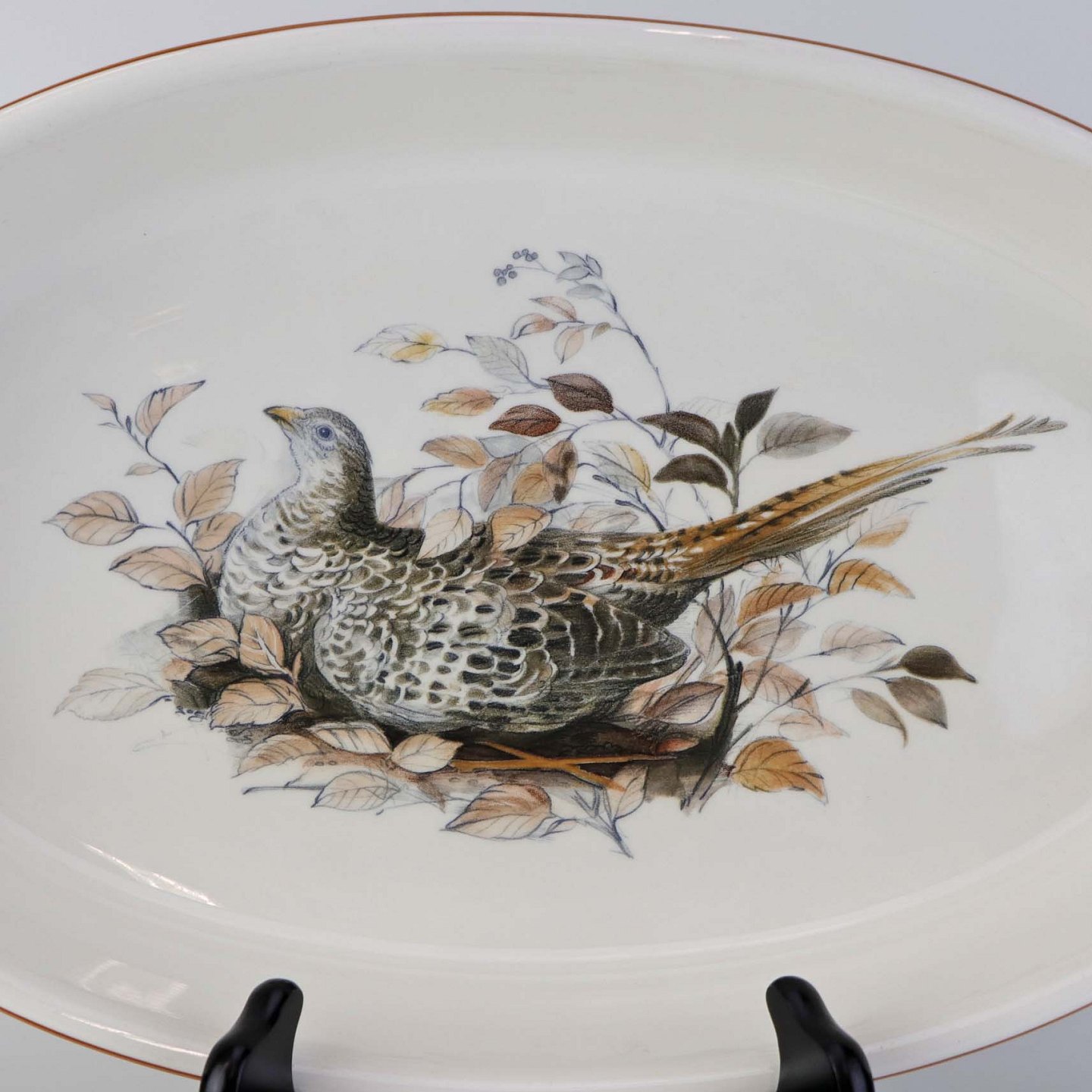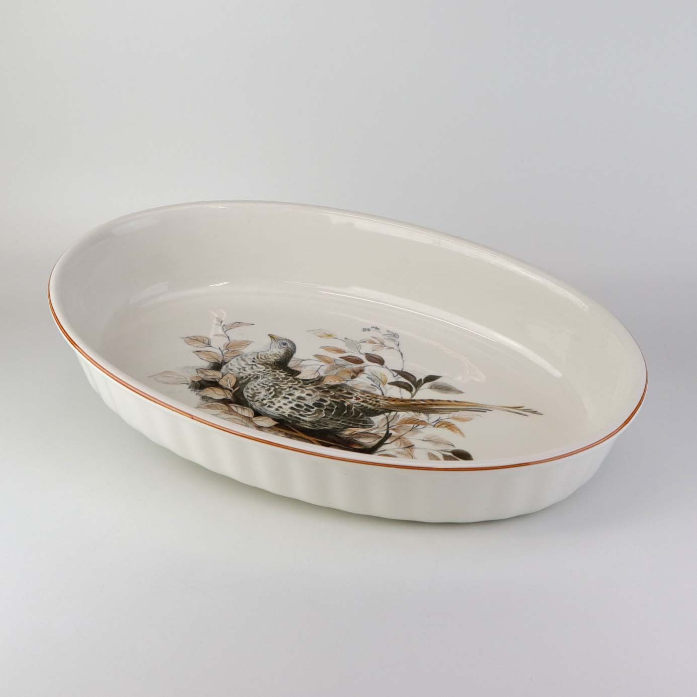 Ovalt ildfast fad i porcelæn med motiv af agerhøne på rede fra stellet Jagtstel. Nr. 2