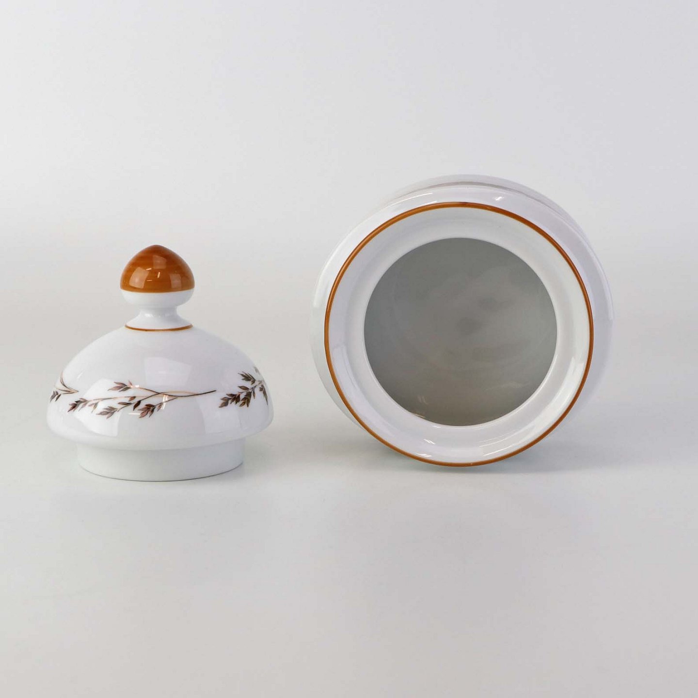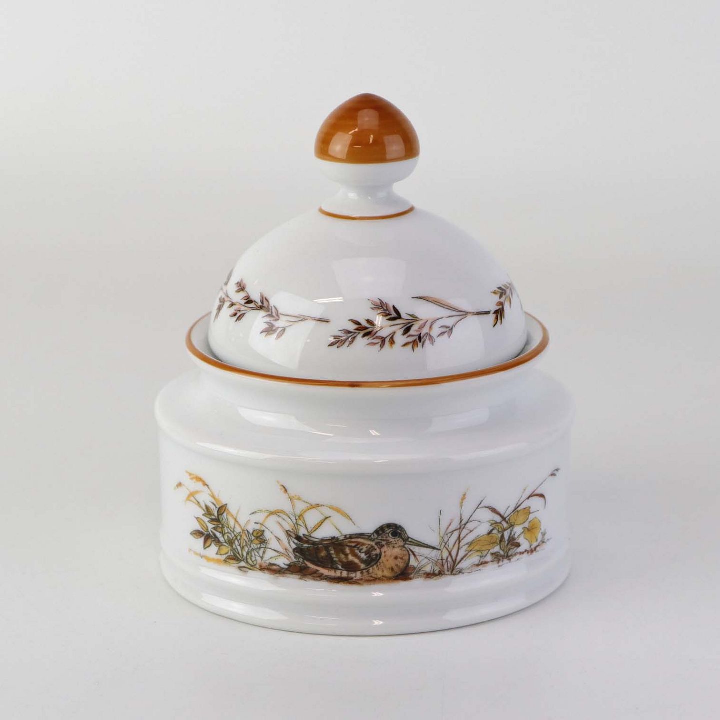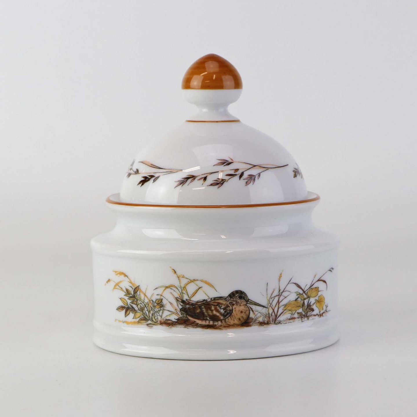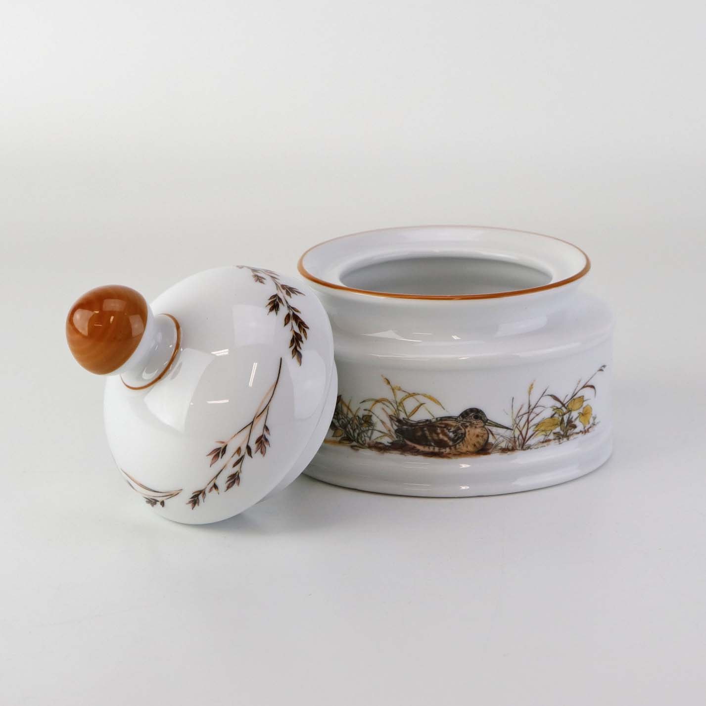 Lågkrukke til sukker i porcelæn med motiv af en sneppe fra stellet Jagtstel.