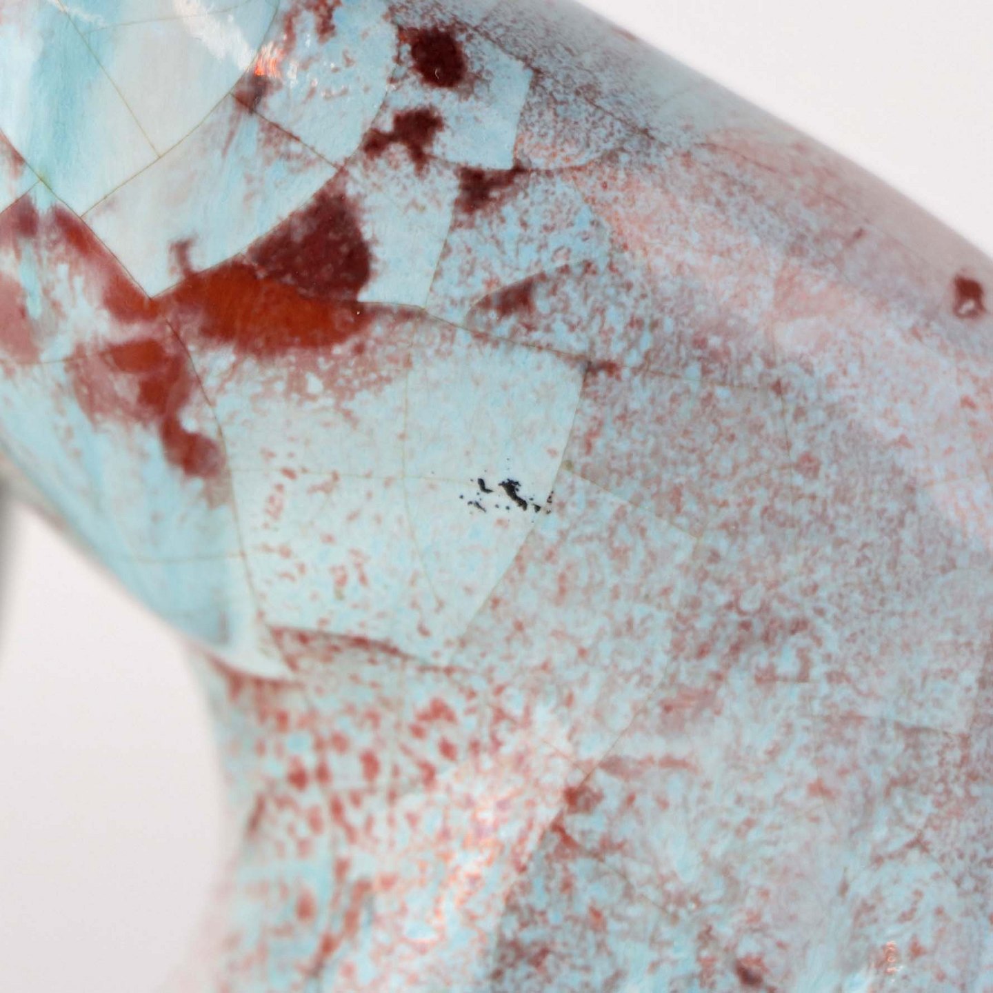 Figur i keramik med motiv af en kvinde, som danser. Figuren er glaseret med krakele glasur i lyse farver. Nr. 5236-1