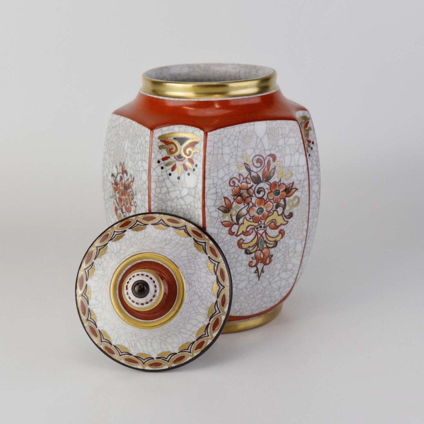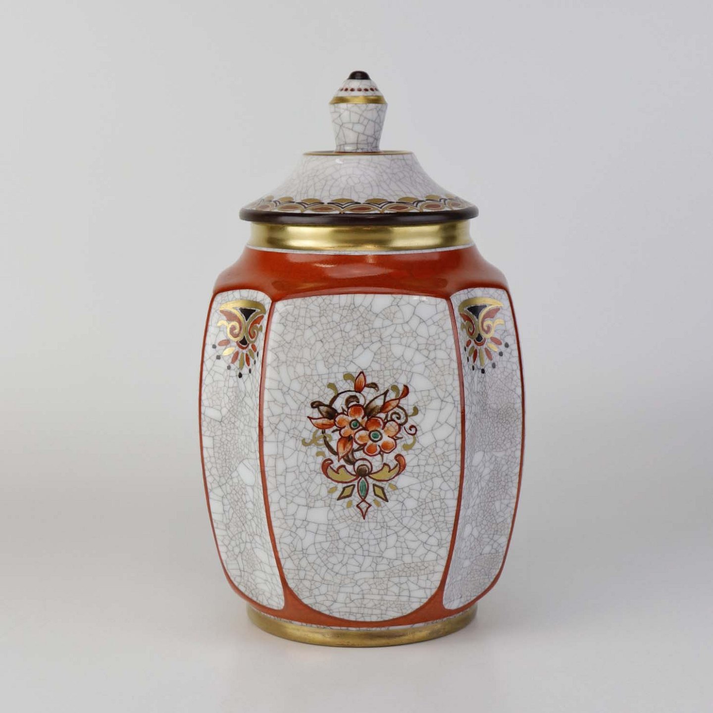 Kantet krukke med låg i porcelæn med krakele glasur og motiv af blomster samt kantet med orangerød bort og guld kant. Nr. 196/600