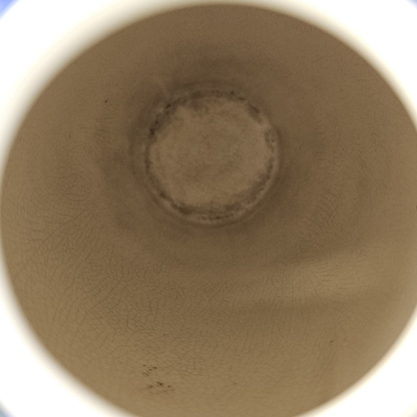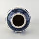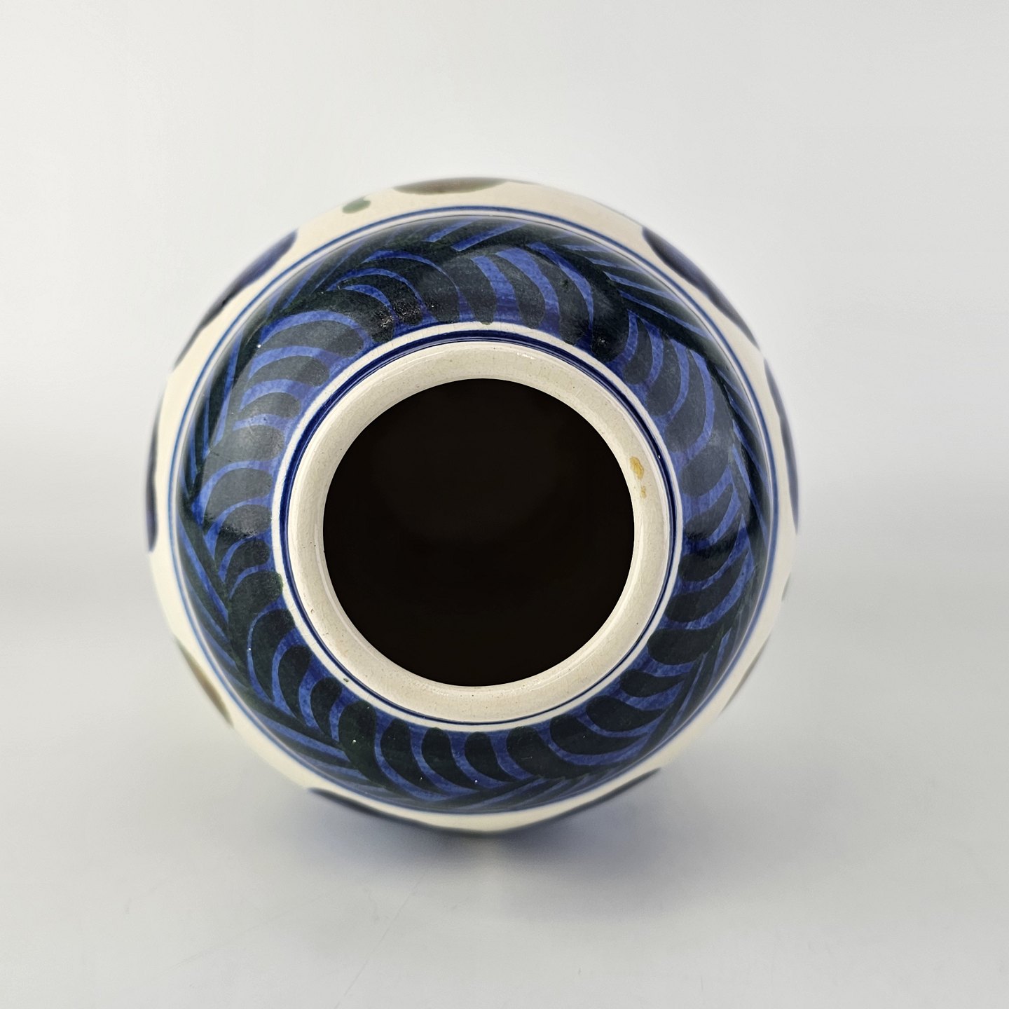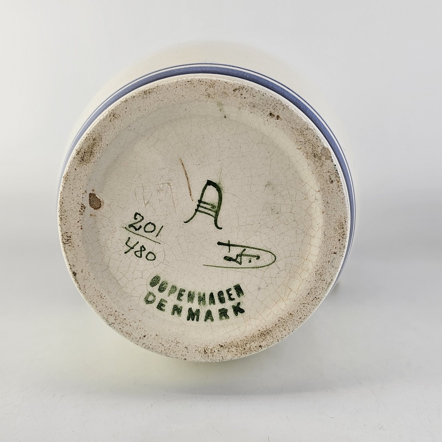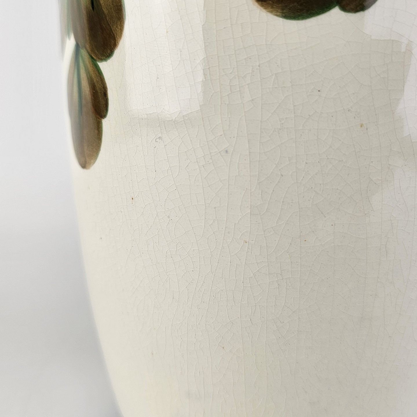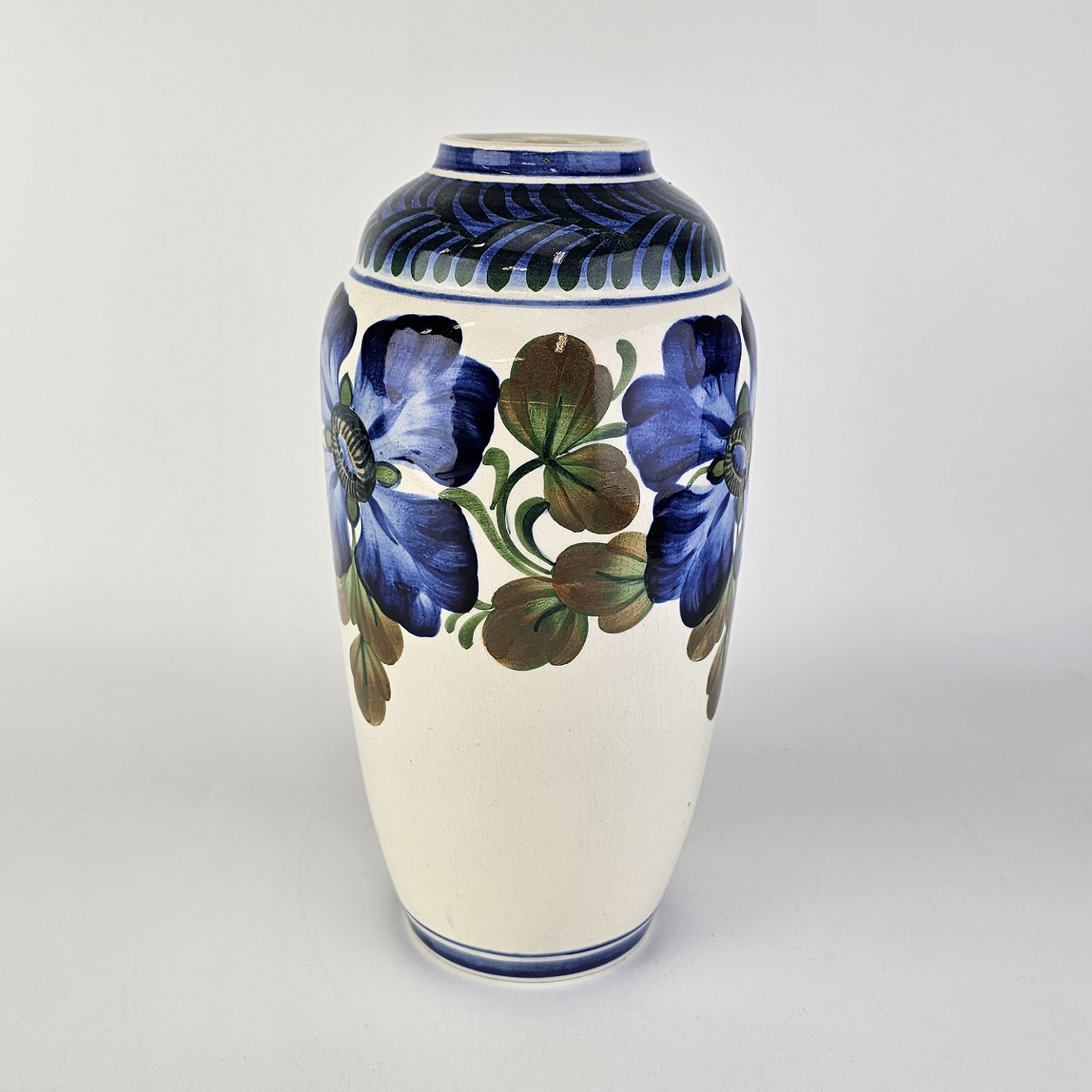 Kunstfajance vase i cremefarvet glassur med dekoration af en blå blomst og grønne blade fra 1907