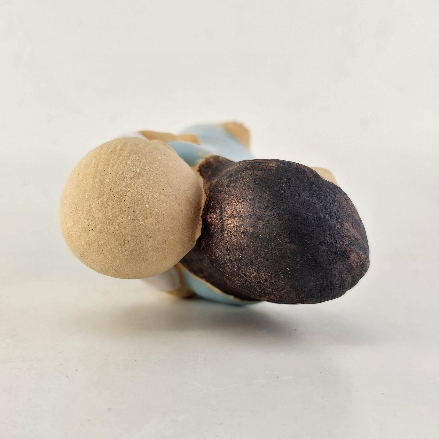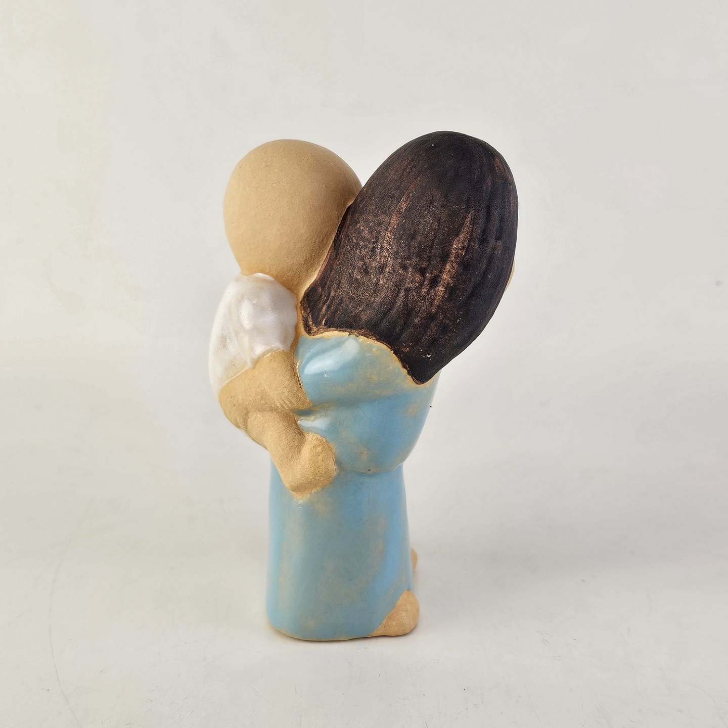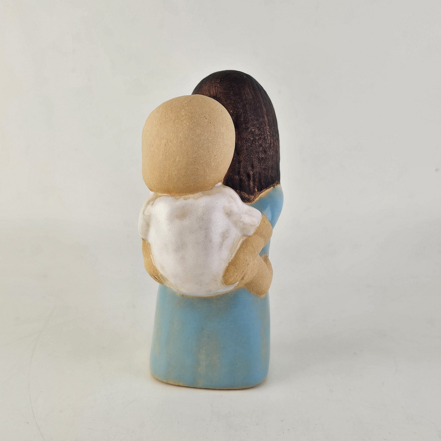 Figur i keramik med motiv af en pige med lys hud og brunt hår, som har et barn på ryggen.