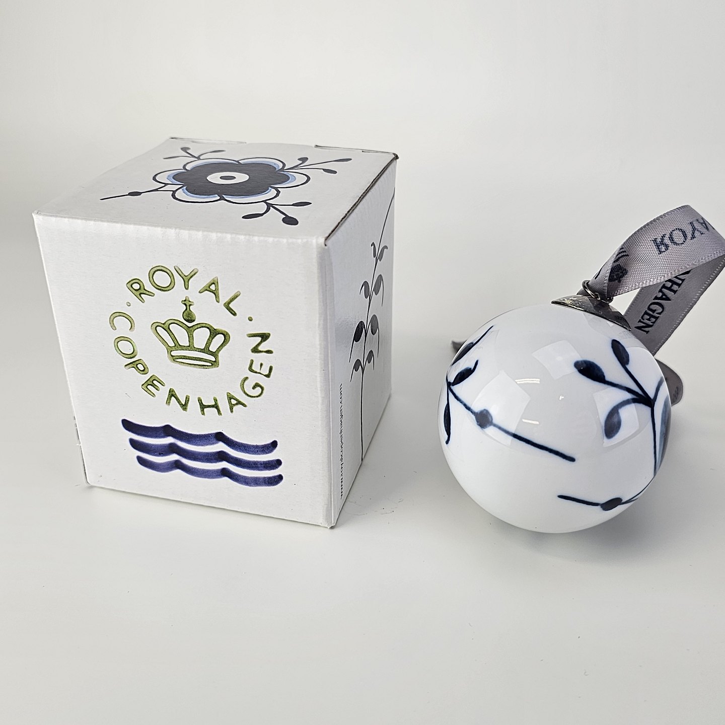 Håndmalet julekugle af porcelæn med blå mega musselmalet mønster. Der medfølger original æske.