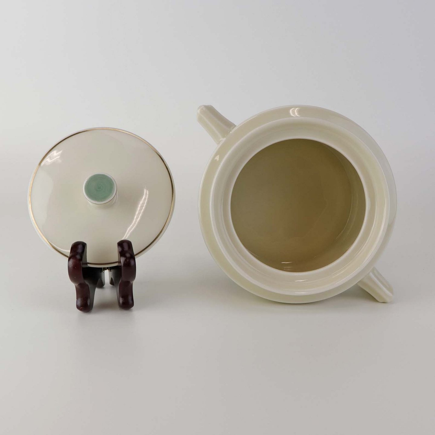 Stel i glat råhvidt porcelæn dekoreret med lysegrøn stribe og guldkant samt motiv af hjertegræs.