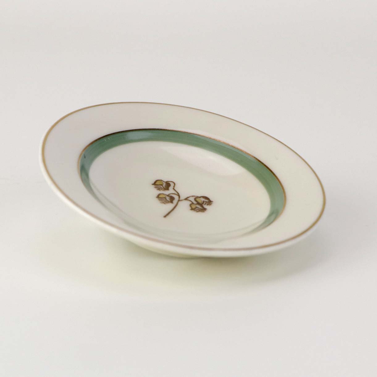 Stel i glat råhvidt porcelæn dekoreret med lysegrøn stribe og guldkant samt motiv af hjertegræs.