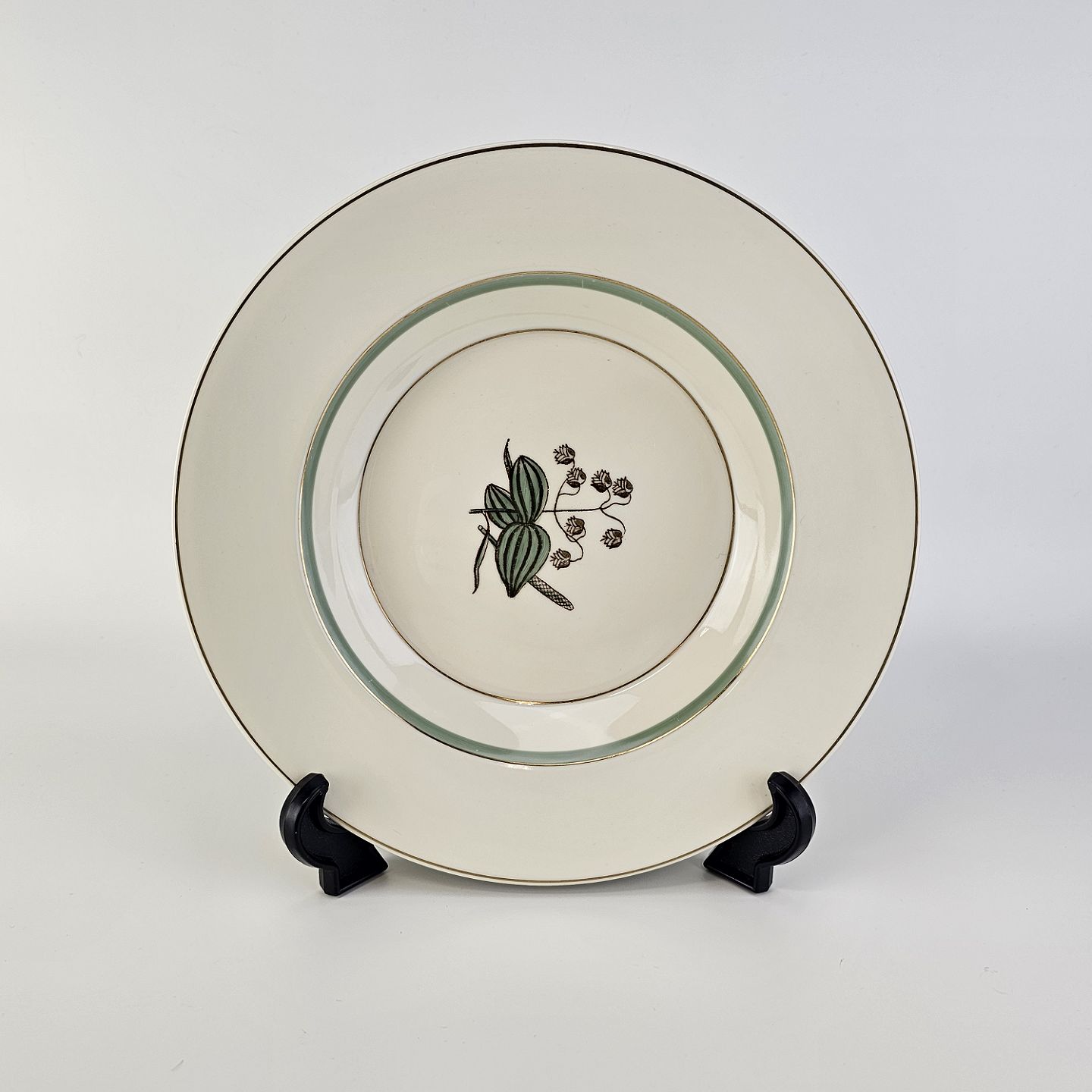 Stel i glat råhvidt porcelæn dekoreret med lysegrøn stribe og guldkant samt motiv af hjertegræs.