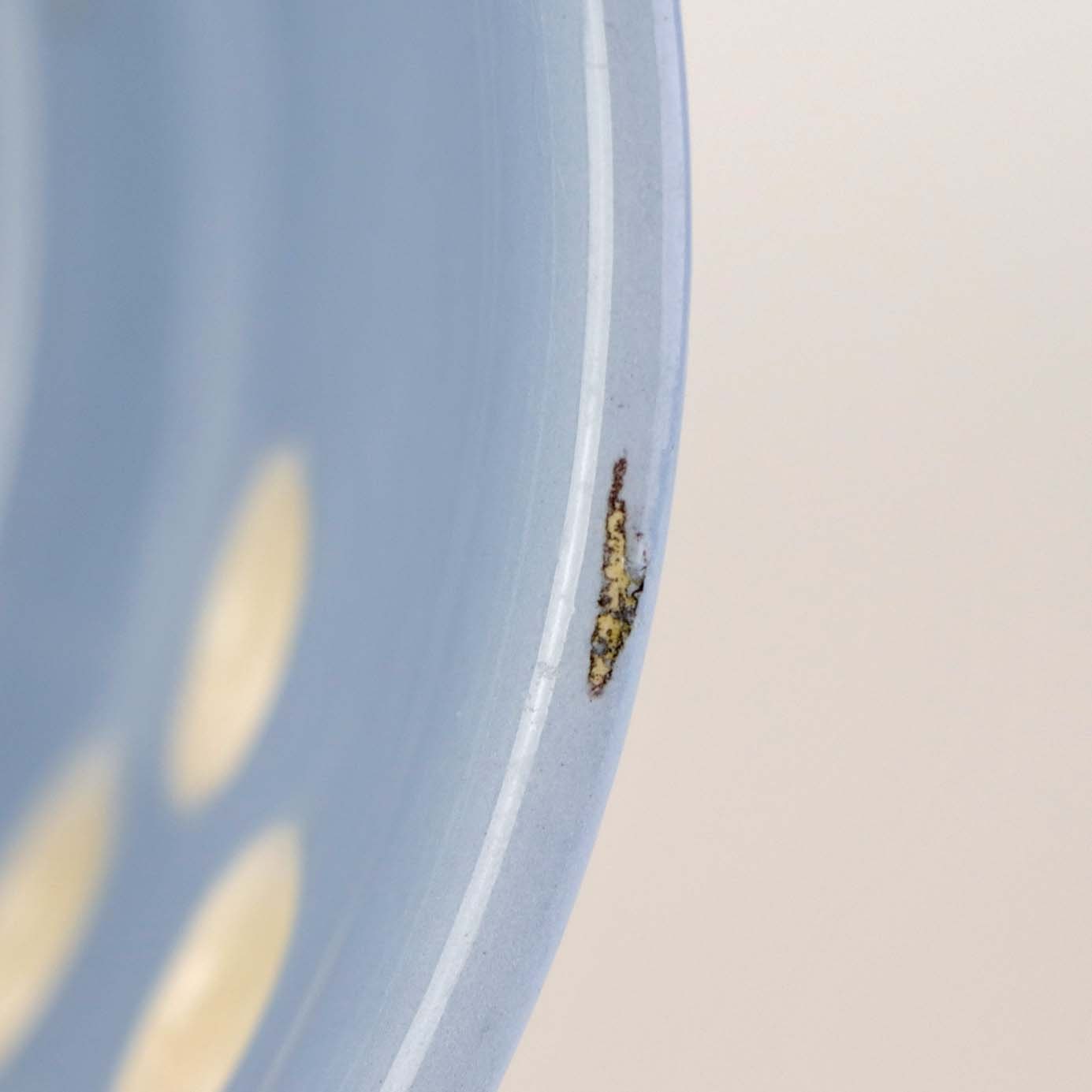 Fremstår med krakkeleringer i glasuren, mindre rest af tape, ujævnhed i glasuren under topfladen samt brugsspor på topkanten.