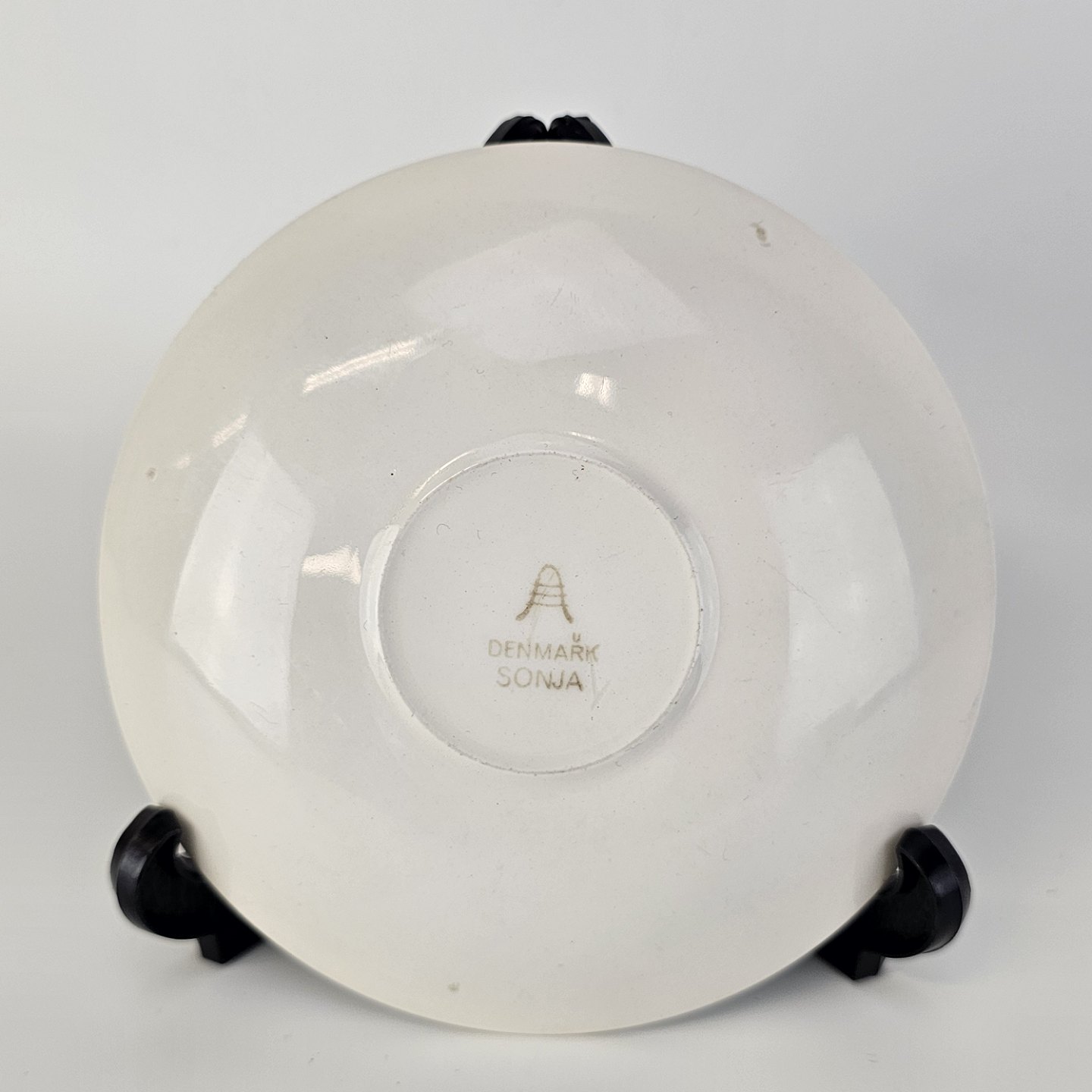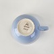 Fremstår med krakeleringer i glasuren og nister på underkoppen