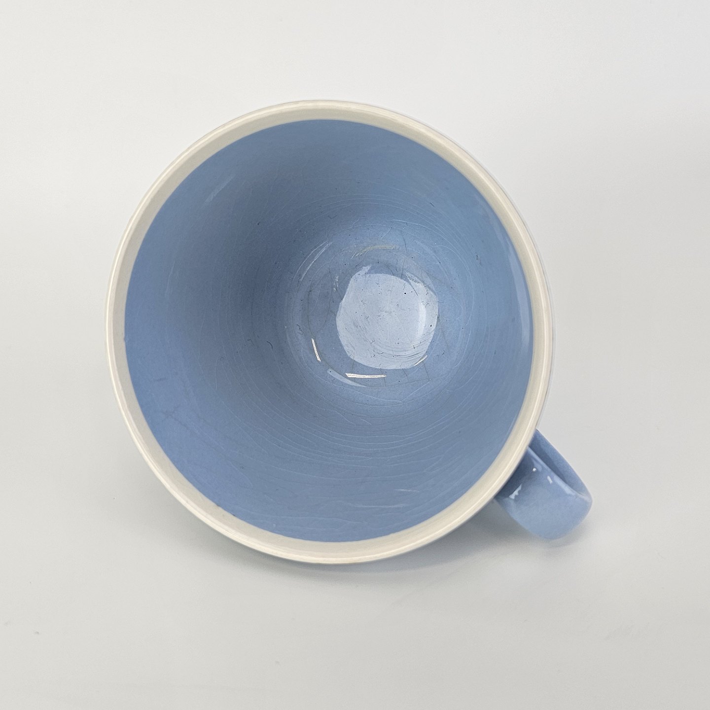Service i lyseblå fajance dekoreret med hvid kant