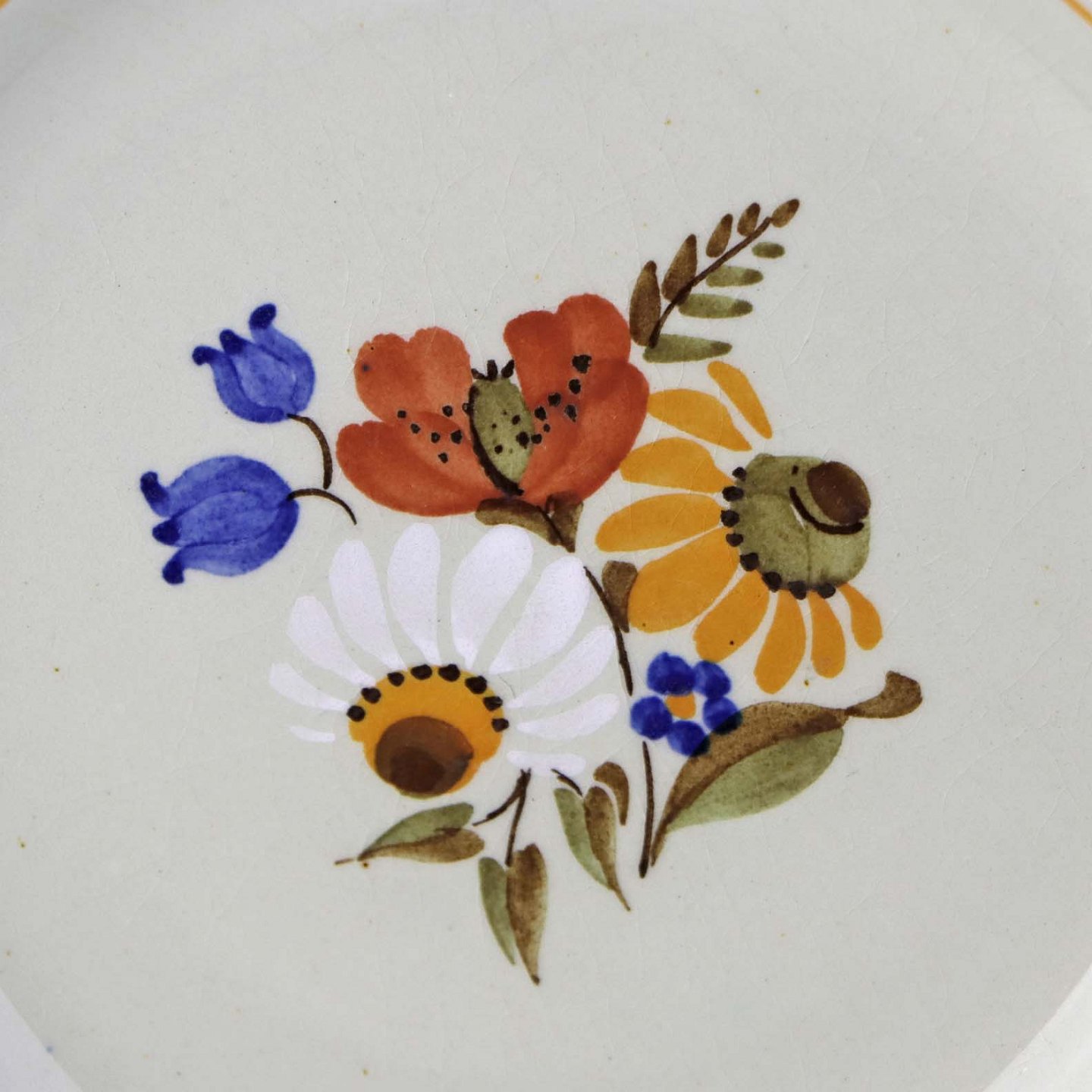 Fremstår med mindre sorte nister og mørkning under glasuren på tallerkens frontside.