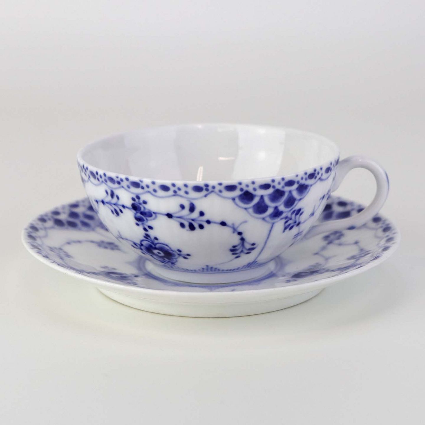Lille tekop med underkop i kongeligt porcelæn fra stellet Musselmalet Halvblonde. Nr. 1/523 og 1/527-528