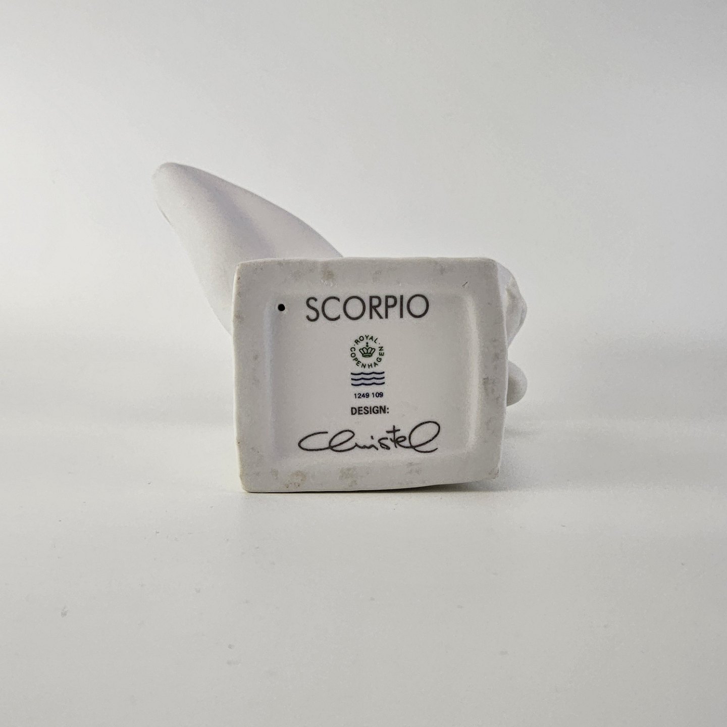 Figur i hvidt kongeligt porcelæn med motiv af stjernetegnet skorpionen og titlen Scorpio