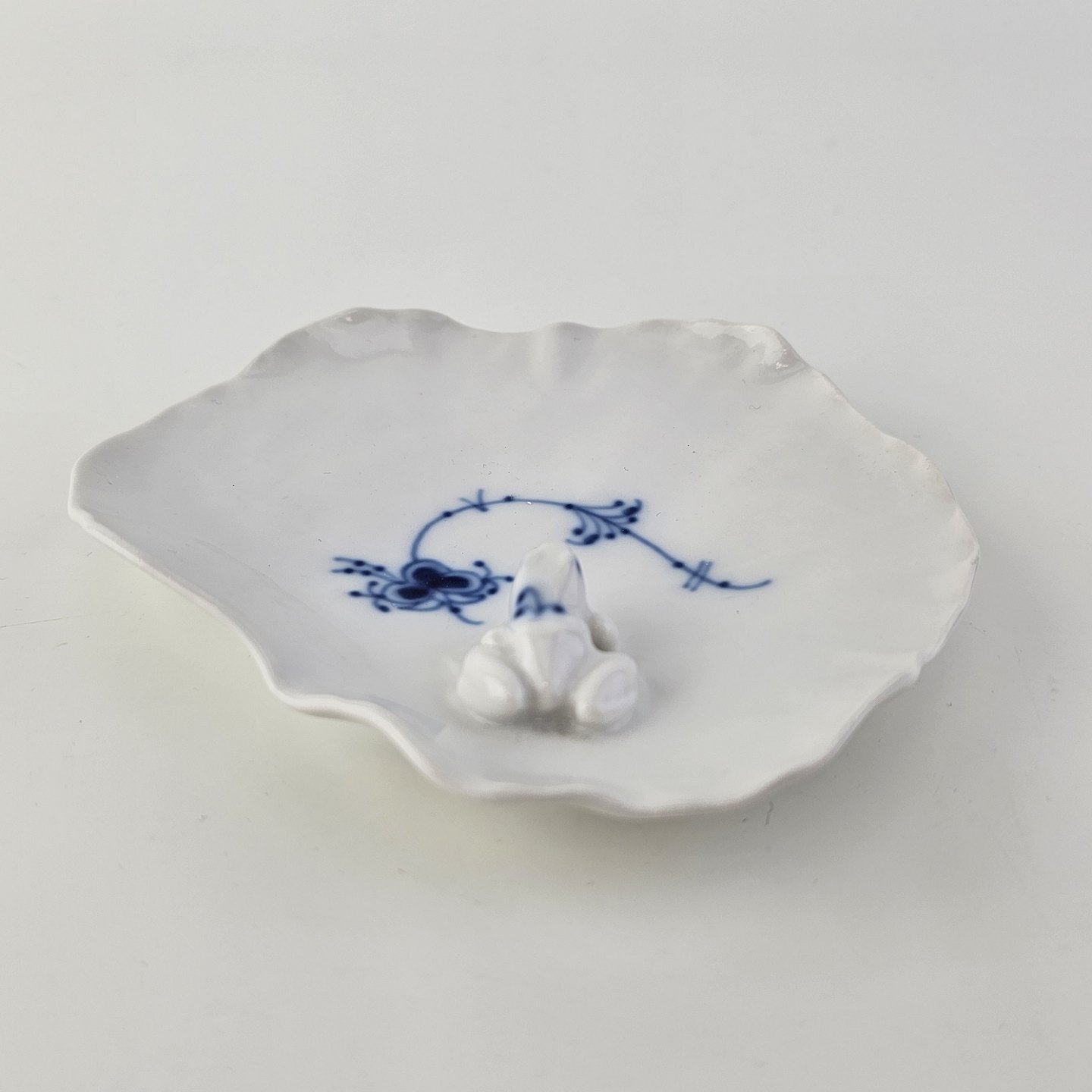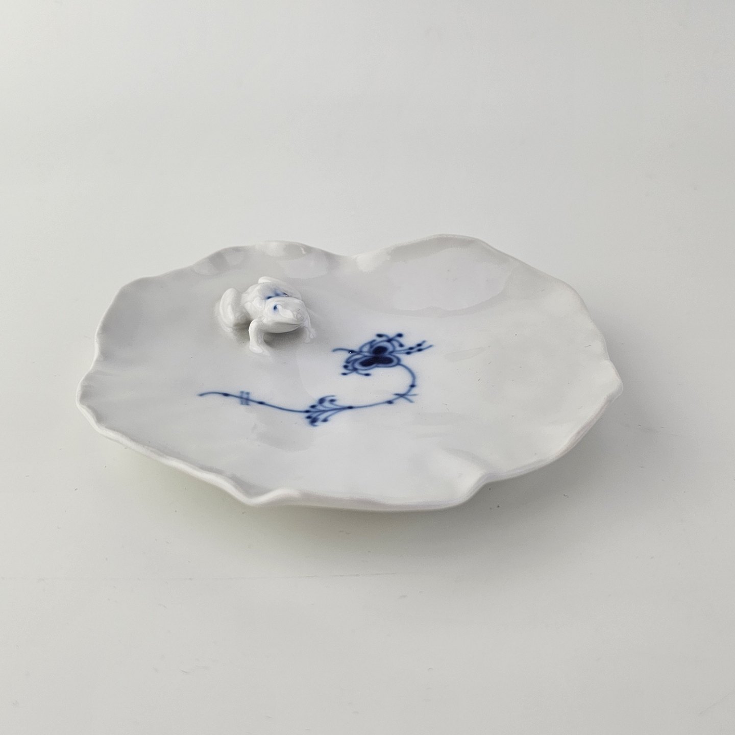 Skål i hvidt kongeligt porcelæn med motiv af en frø på en åkande og musselmalet dekoration