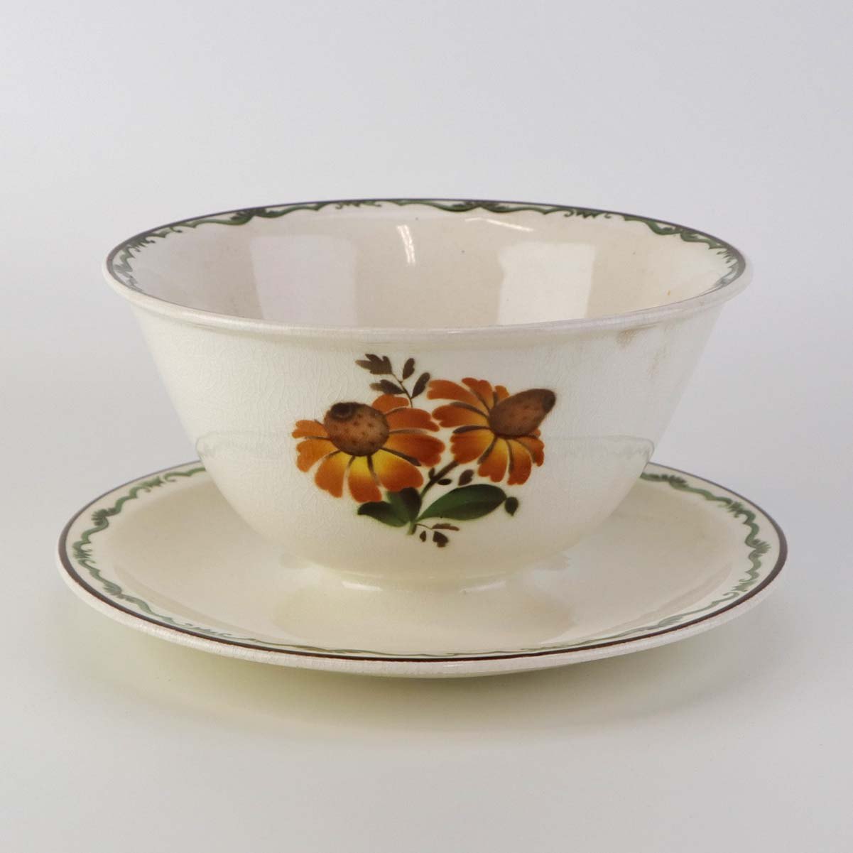 Fajancestel i stelform G med dekoration af orangegule blomster og grønne guirlander på lys baggrund med brun kant.