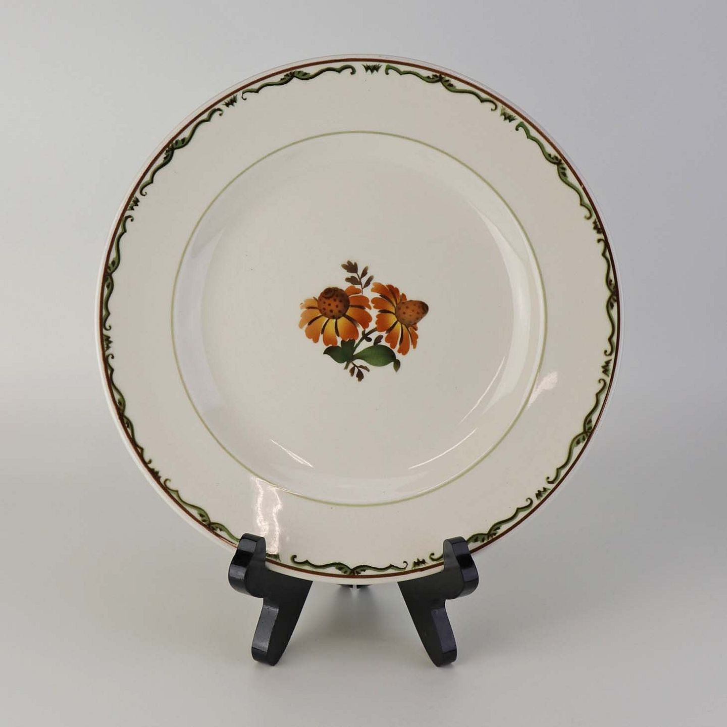 Fajancestel i stelform G med dekoration af orangegule blomster og grønne guirlander på lys baggrund med brun kant.