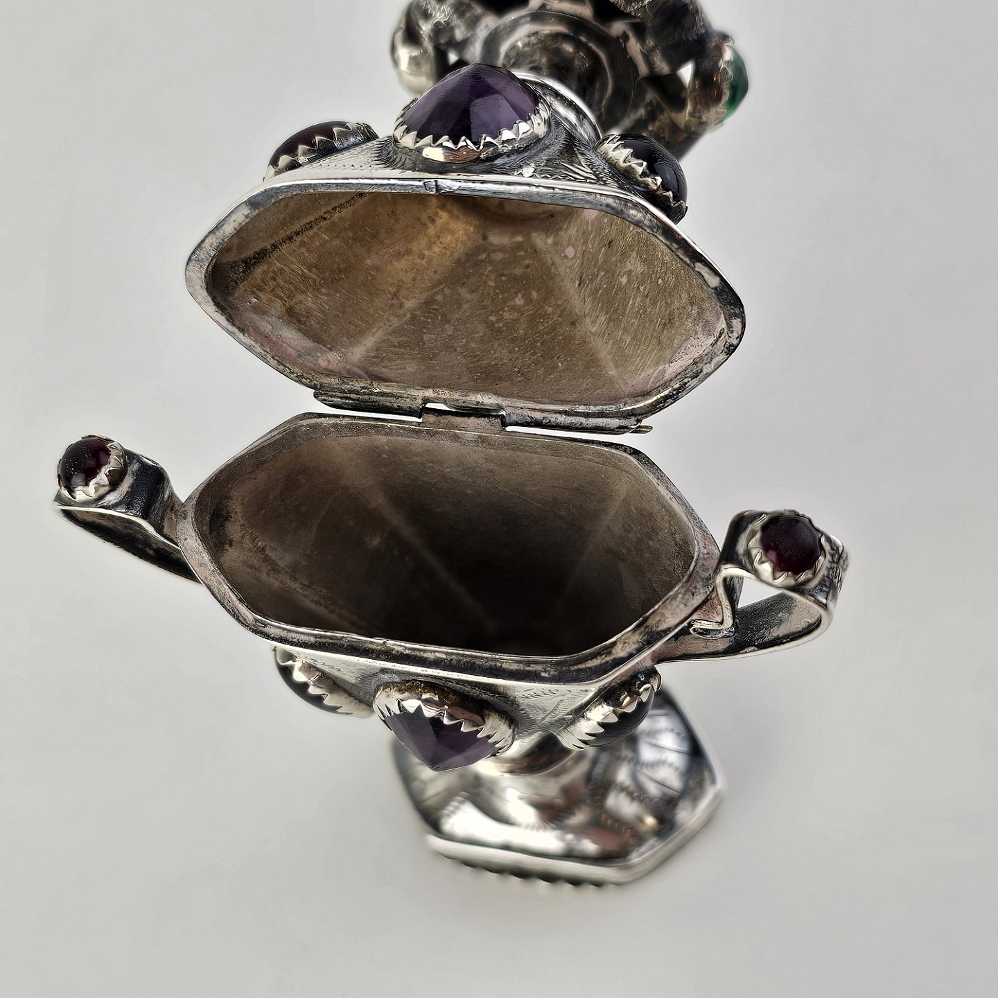 Hovedvandsæg i sølv dekoreret med forskellige smykkesten. Indgraveret under bunden med et hjerte, initialer og årstallet 1955