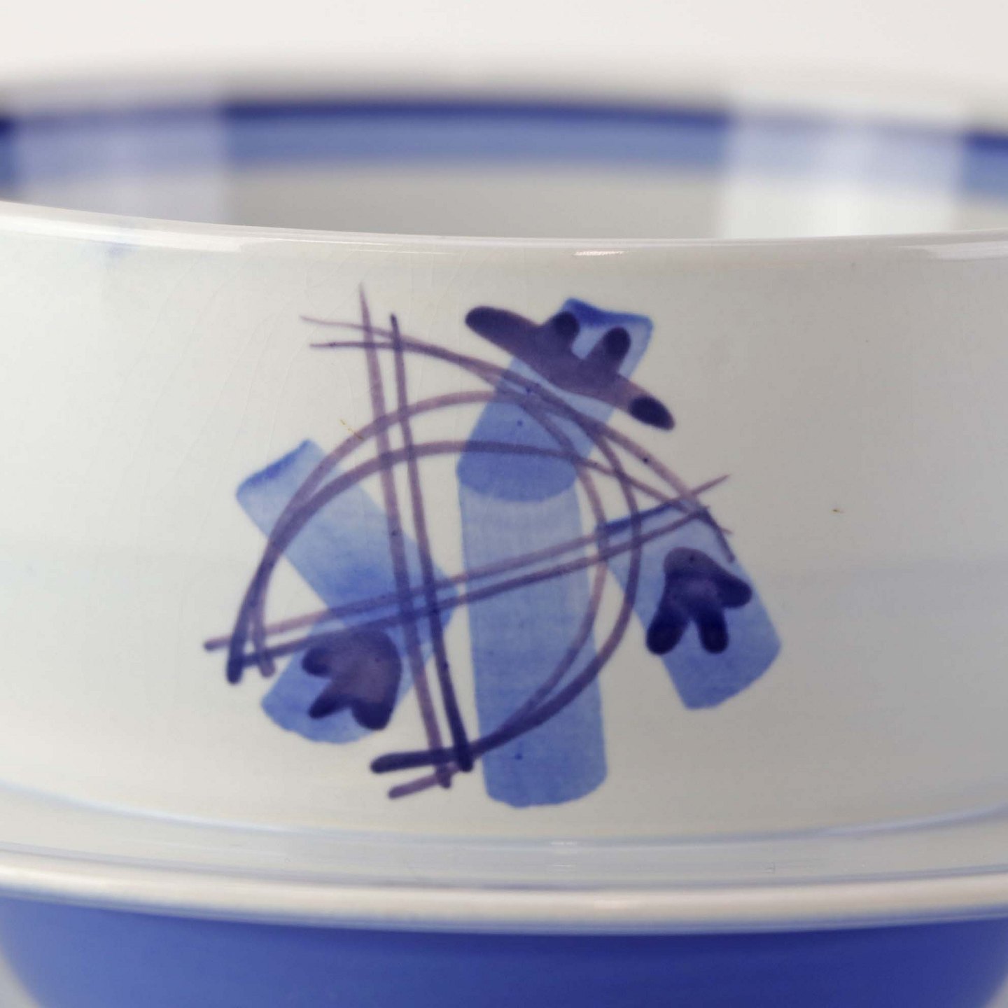 Fajancestel i stelform CA med dekoration af abstrakt motiv i blå og lyseblå på en råhvid baggrund.
