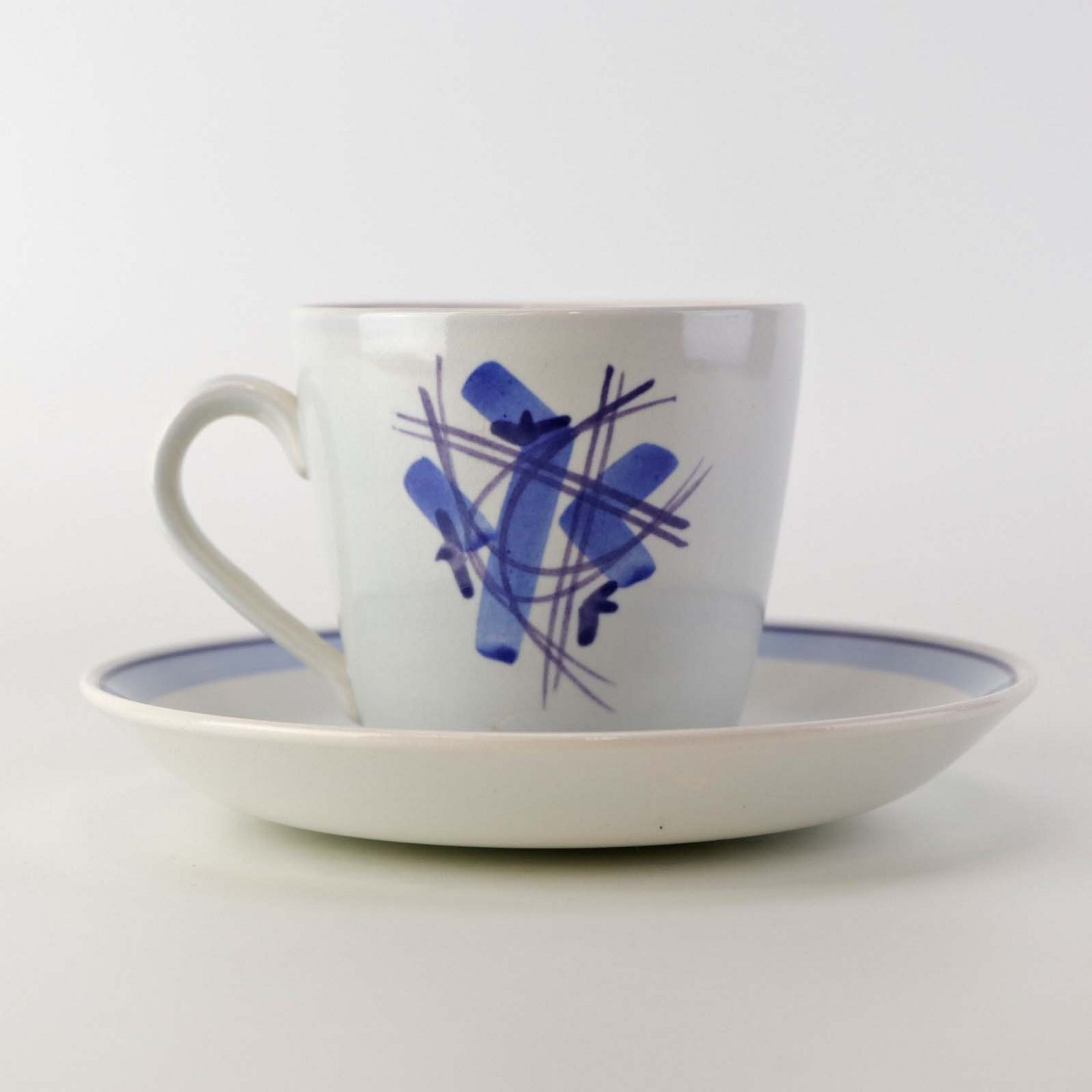 Fajancestel i stelform CA med dekoration af abstrakt motiv i blå og lyseblå på en råhvid baggrund.