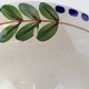 Fajancestel med dekoration af ranker af blåregn og blade på lys baggrund afsluttet med kant af runde blå pletter.