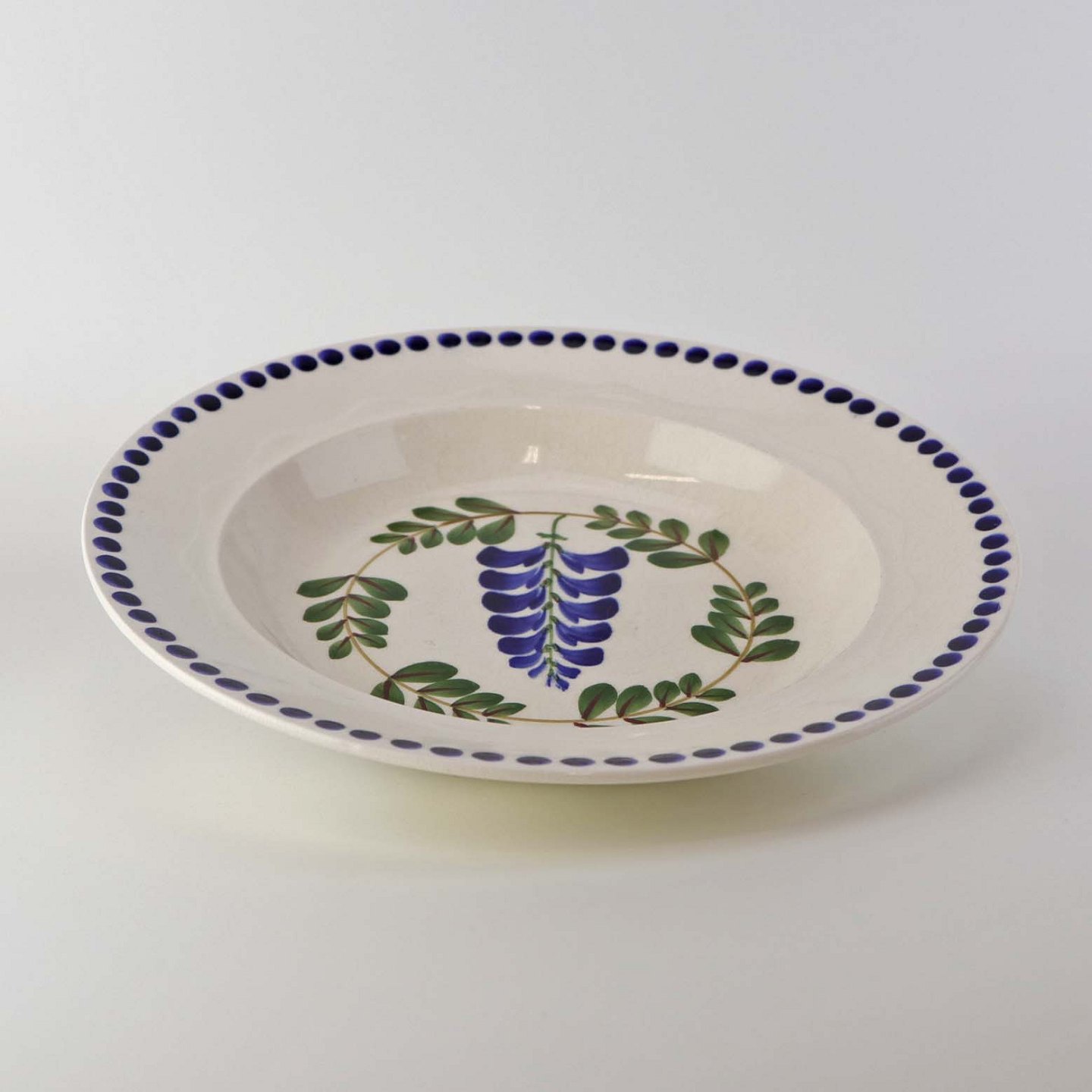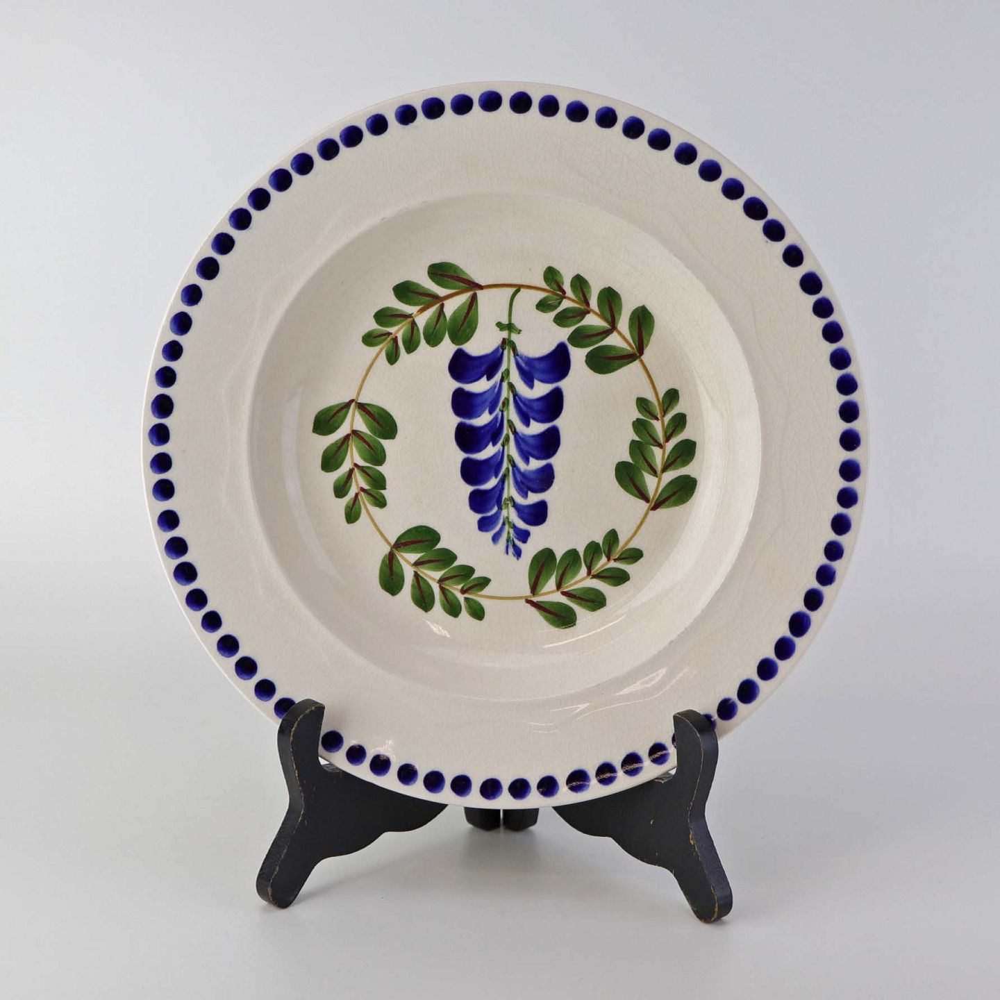 Fajancestel med dekoration af ranker af blåregn og blade på lys baggrund afsluttet med kant af runde blå pletter.