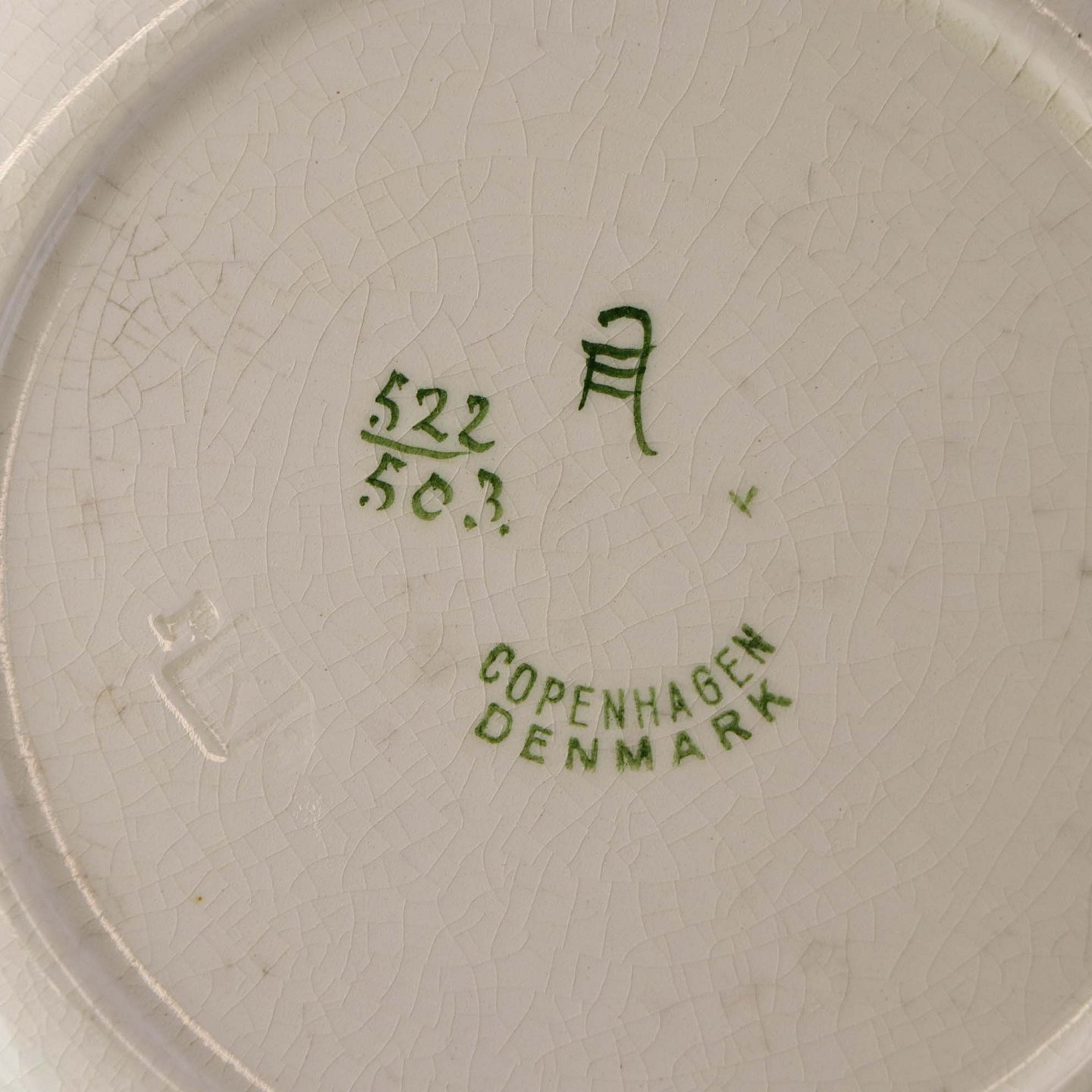 Fremstår med krakkeleringer i glasuren, brugsspor på dekorationen og under bund.