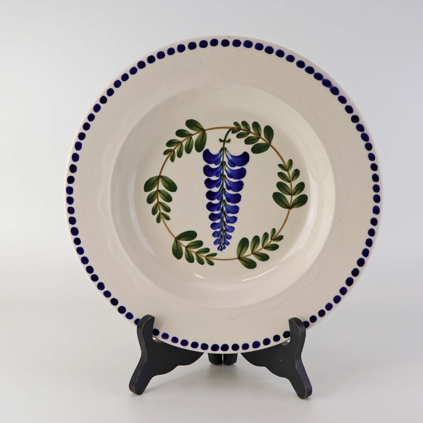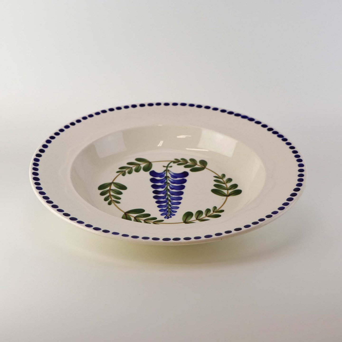 Fajancestel med dekoration af ranker af blåregn og blade på lys baggrund afsluttet med kant af runde blå pletter.