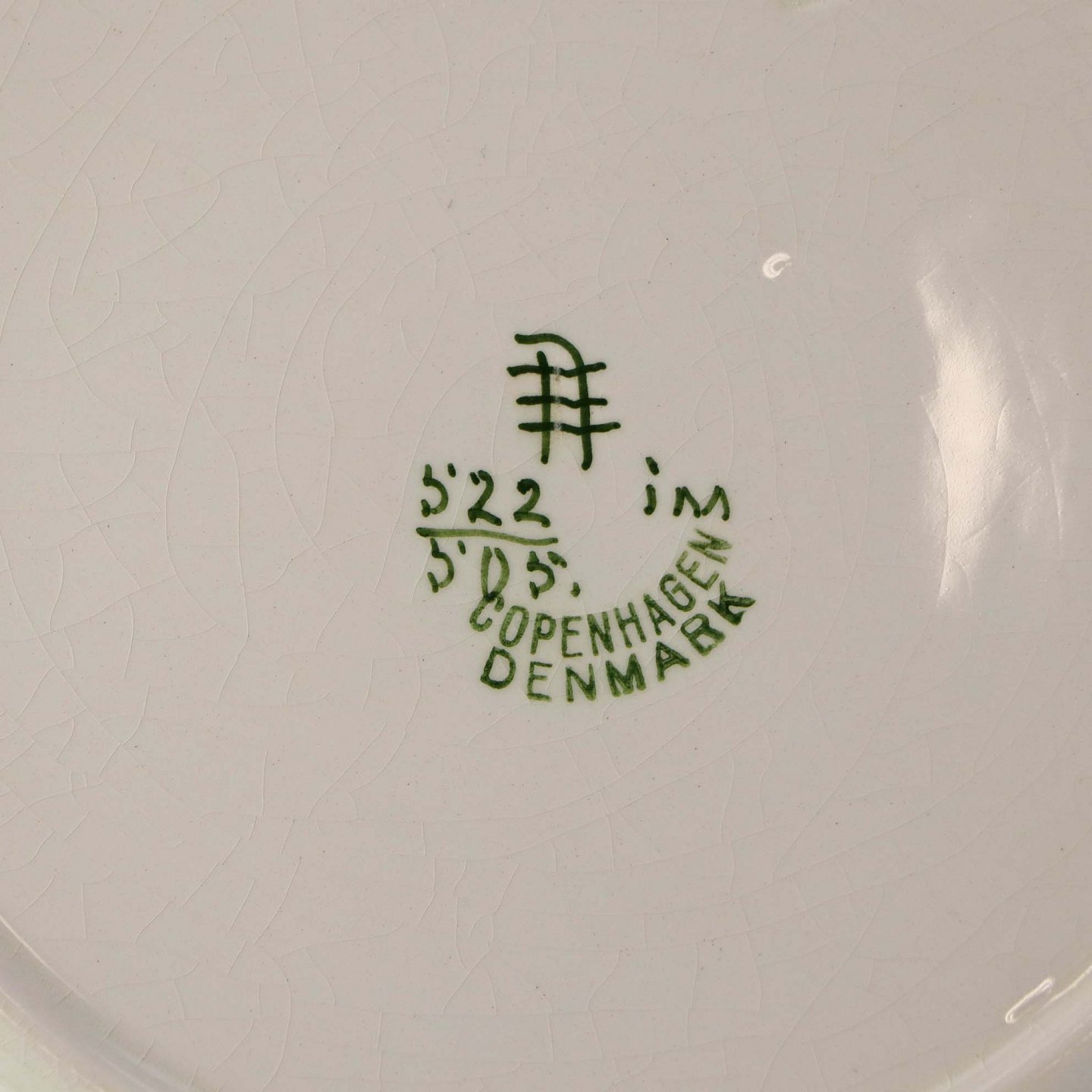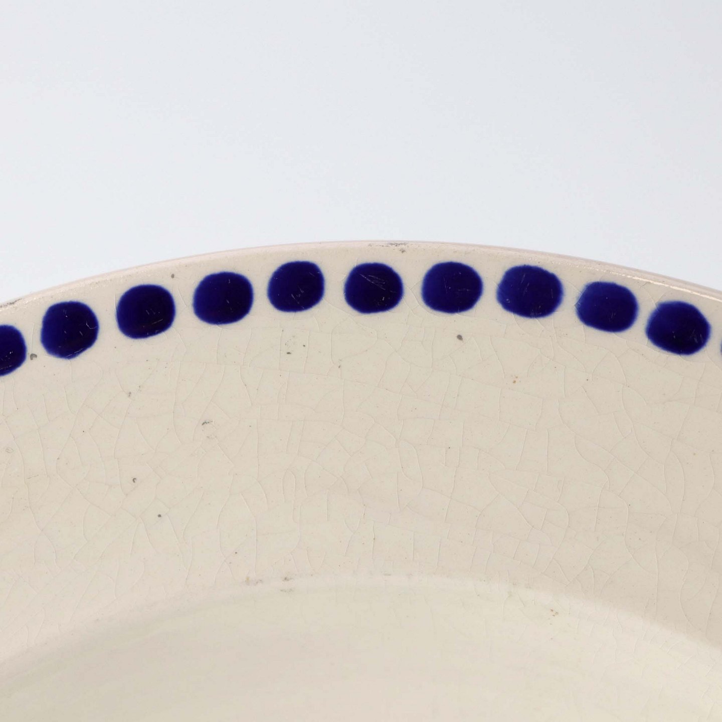 Fremstår med krakkeleringer i glasuren, nister og ujævnheder i dekorationen.