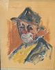 Oliekridt på papir monteret i hvidmalet ramme med motiv af en klovn