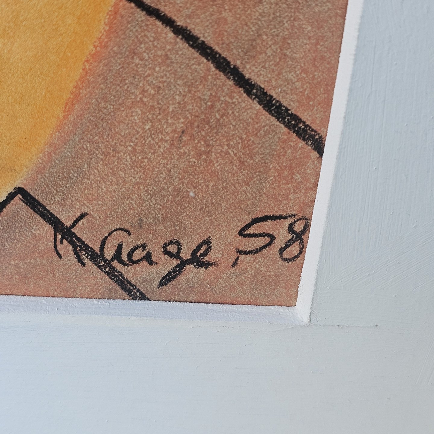 Tryk på papir monteret i hvid ramme med abstrakt motiv af gule former på sort baggrund