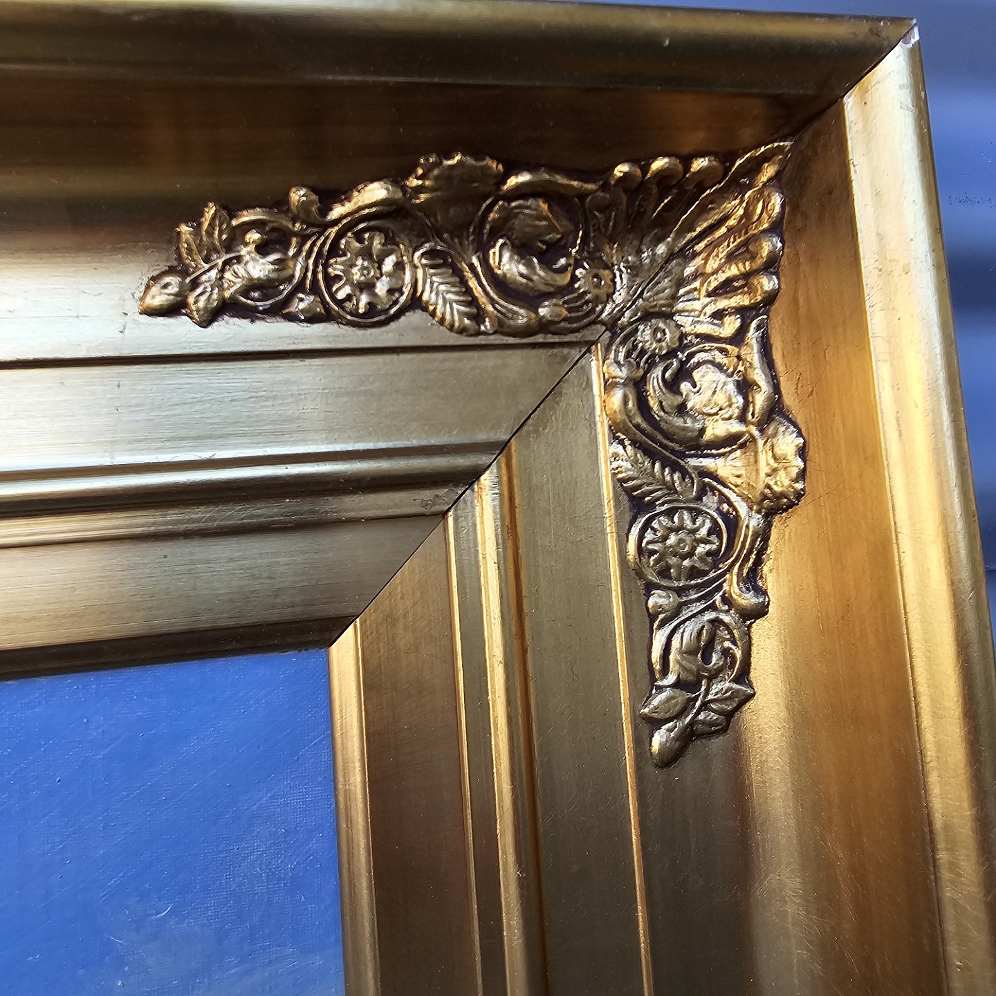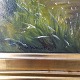 Oliemaleri på lærred i ornamenteret guldramme med motiv af en pige med gæs ved en gård