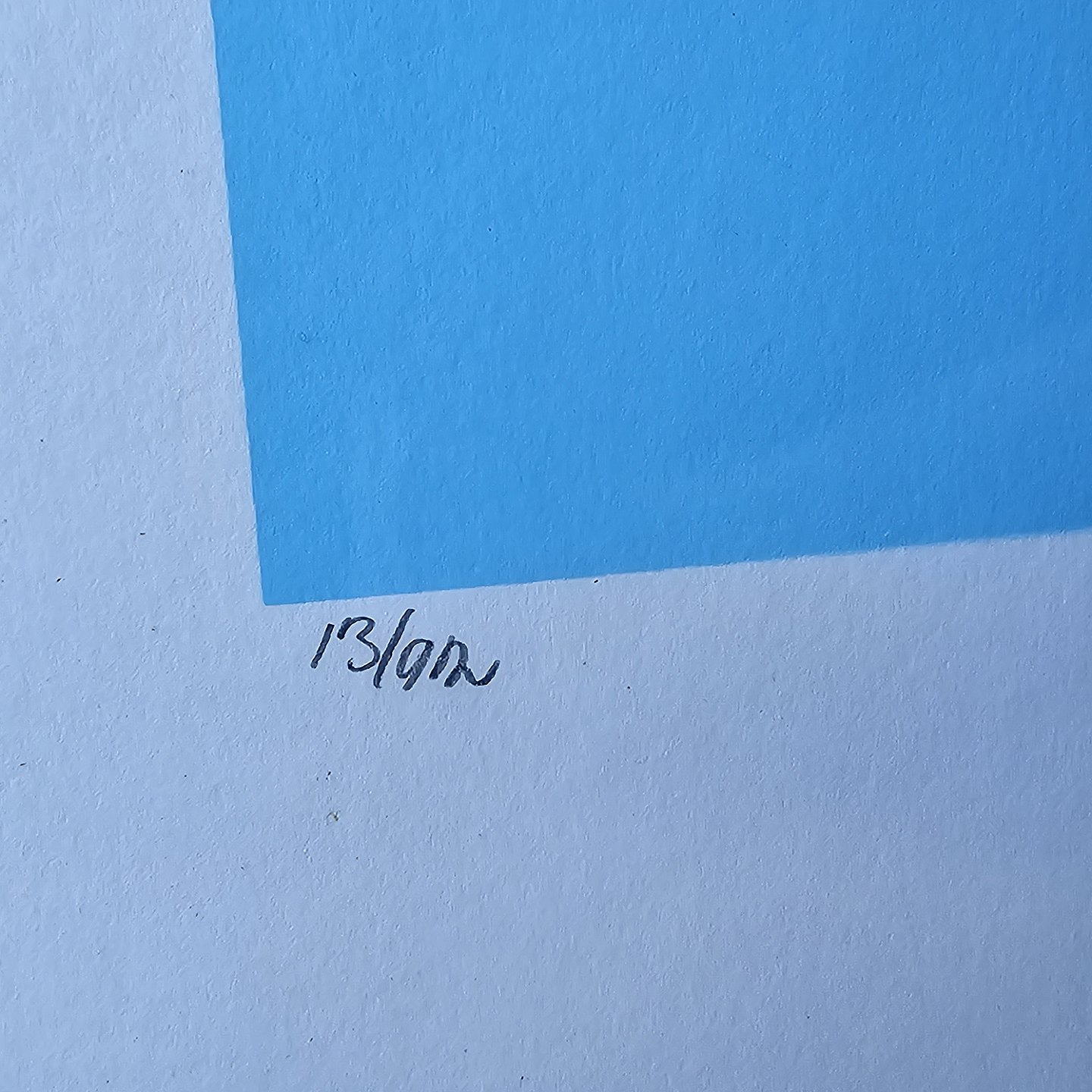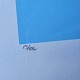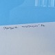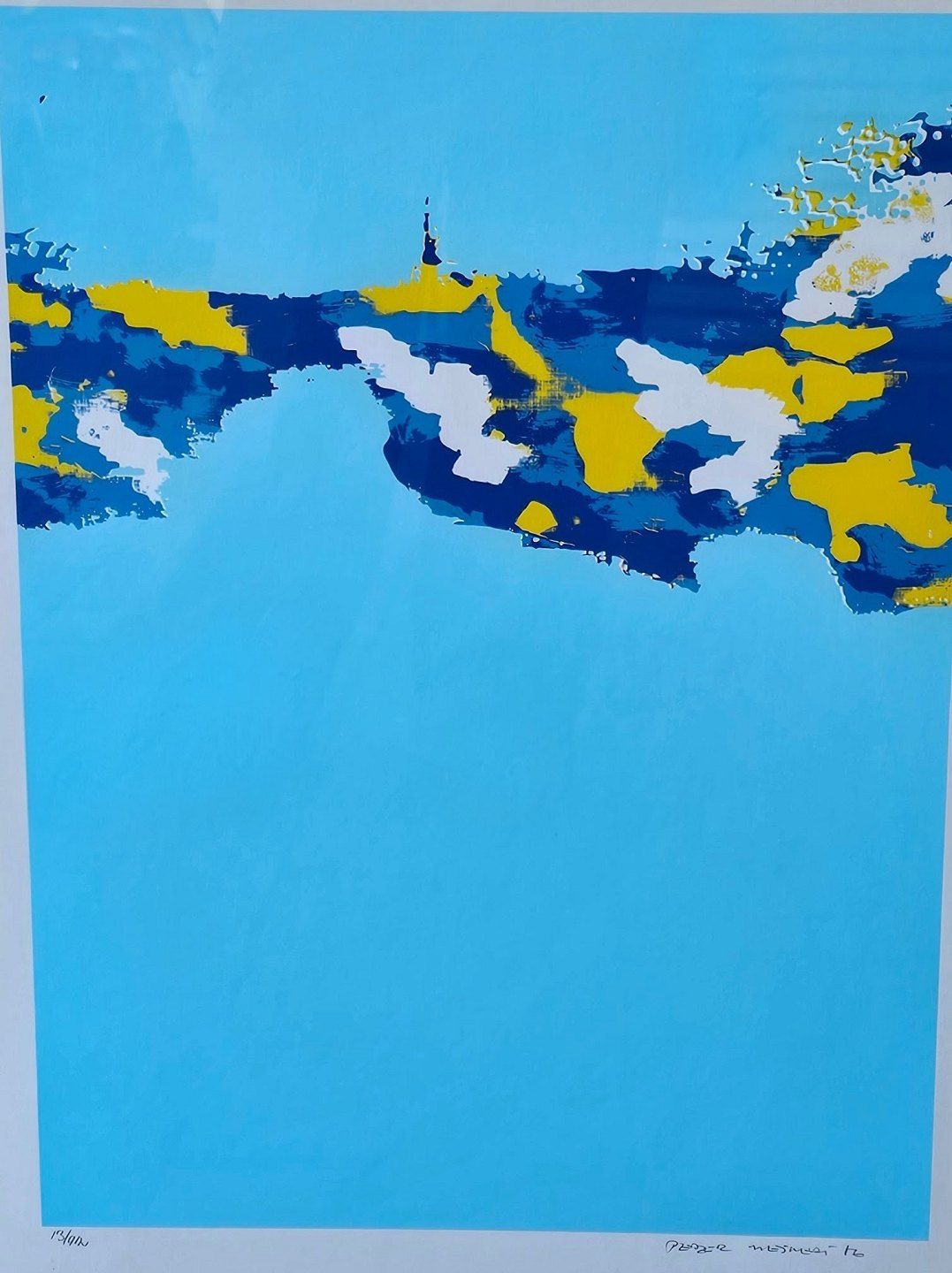 Litografi med abstrakt motiv i blå, gul og hvid på lyseblå baggrund i metal ramme. 13/45