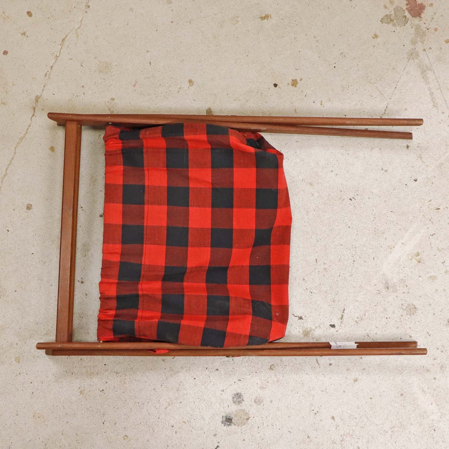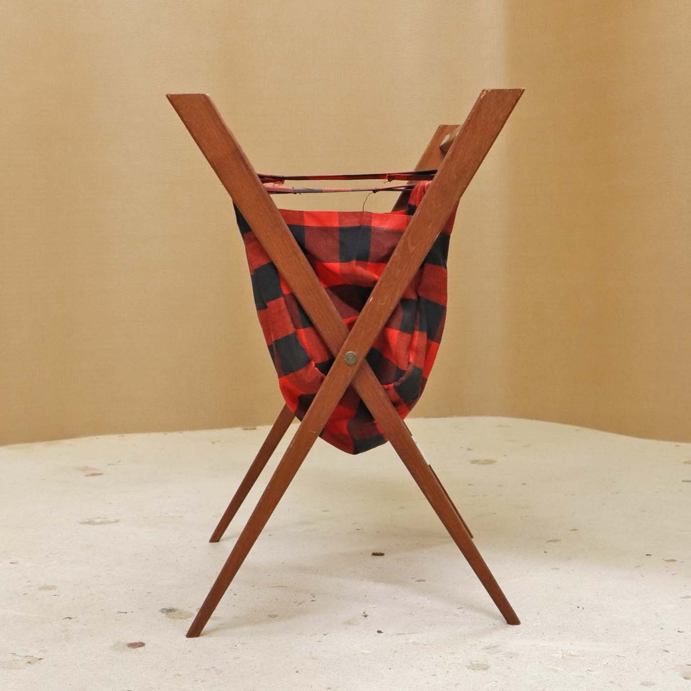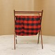 Magasinholder med stel i teaktræ med påmonteret bomuldsstof med mønster af røde og sorte tern. Holderen har to indvendige lommer langs den ene side. Kan også bruges til garn. Holderen kan klappes sammen.