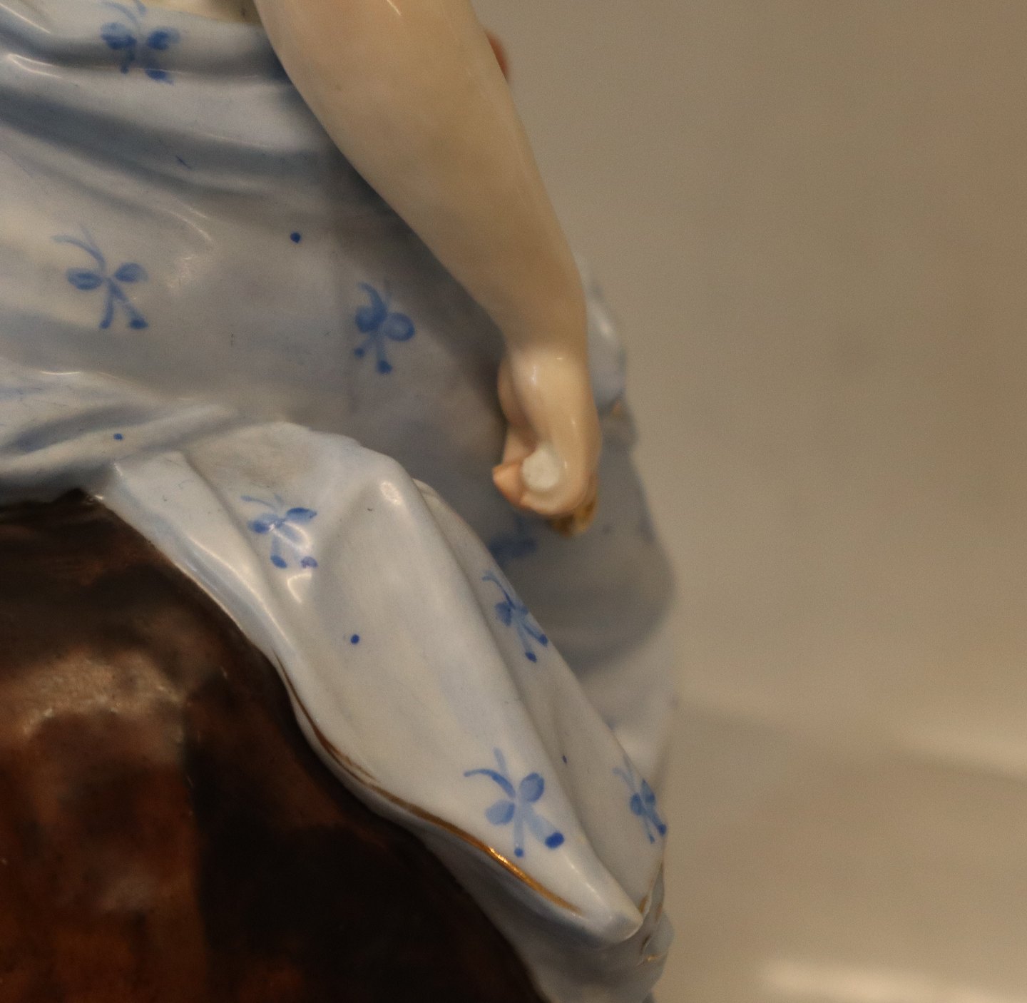 Beskrivelse: 2 Antikke Europæiske figurer 29 x 18.5 cm Kvinde med hund og Kvinde med gedekid Ustemplede men i Meissen stil fra Tyskland, Bøhmen, Østrig eller Italien KPM ? I næsten hel stand