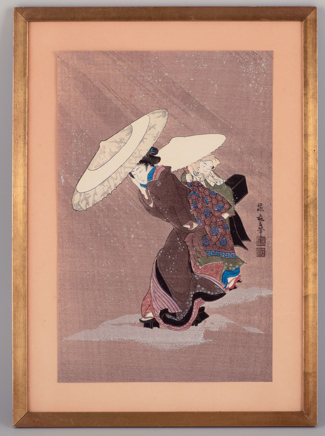 Fujimaro Kitagawa (1790-1850) Woodcut on Japanese paper. Snowscape with a woman in traditional clothing carrying a child.