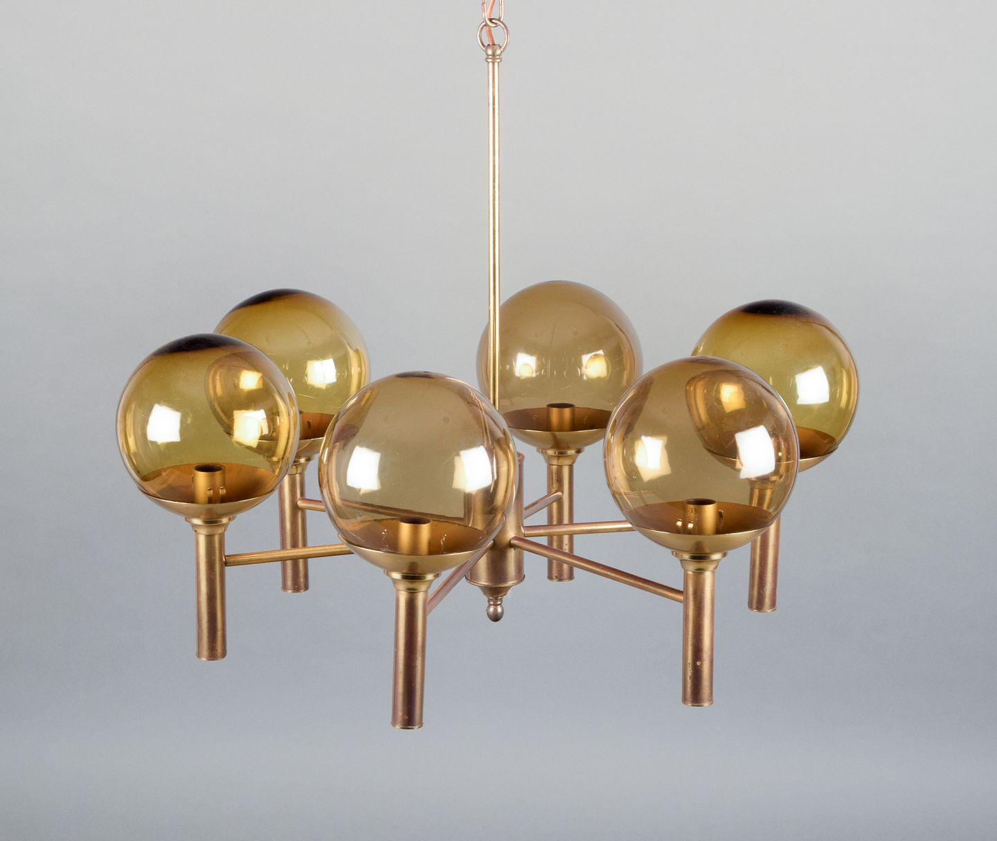 Sv. Mejlstrøm, Danish designer. Brass chandelier with six arms and dome-shaped shades made of amber-colored glass.