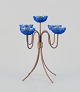 Gunnar Ander for Ystad Metall, Sweden. Tall candlestick holder in brass and blue art glass shaped like flowers. For five candles.