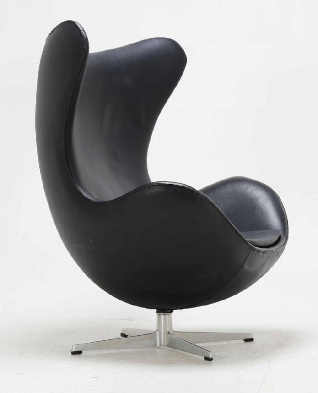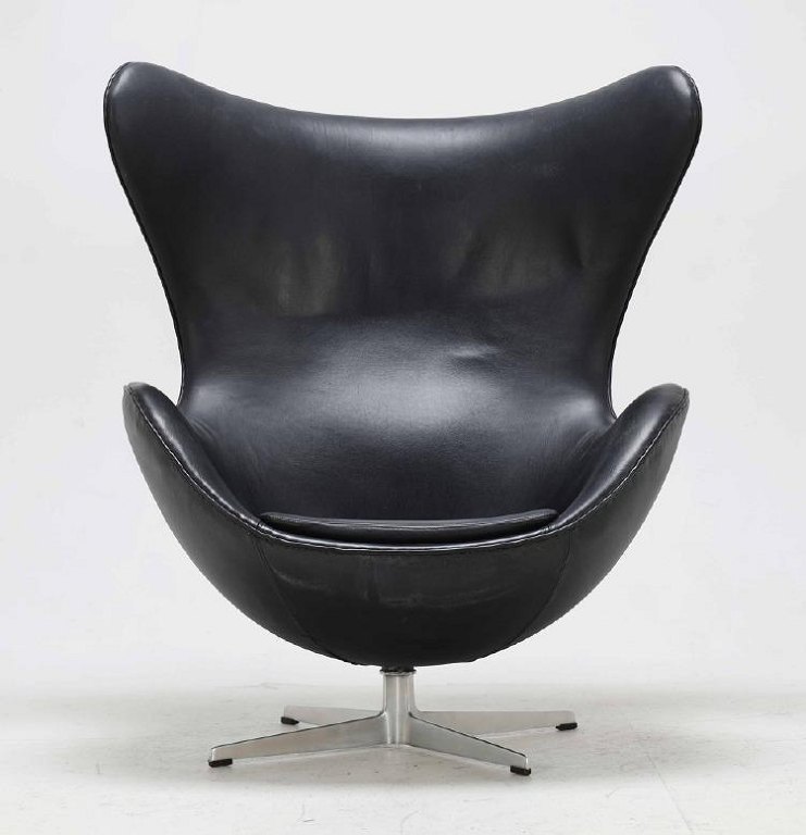 Arne Jacobsen 1902 – 1971. 'The egg'. Armchair, upholstered with black leather, swiveling center column with four-way aluminum foot.